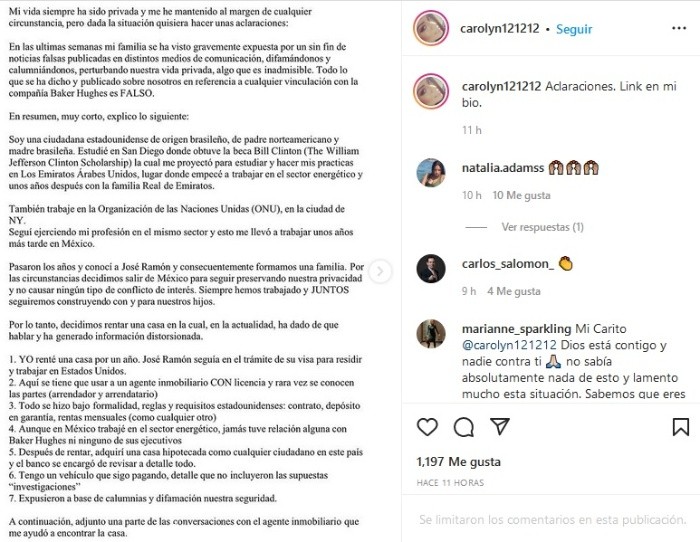 Carolyn Adams, nuera del Presidente Andrés Manuel López Obrador (AMLO), compartió una carta y conversaciones de WhatsApp para aclarar aspectos de su trayectoria profesional y su actual vida en Houston junto a su esposo, José Ramón López Beltrán. A través de su red social Instagram, la nuera de AMLO rechazó todas las acusaciones con respecto a la investigación que presume cierto conflicto de interés con la empresa de servicios petroleros, Baker Hughes, diciendo que es falso. Carolyn sostiene que rentó la casa en Houston sin conocer la identidad del propietario.En el documento se lee: “En las últimas semanas mi familia se ha visto gravemente expuesta por un sin fin de noticias falsas publicadas en distintos medios de comunicación, difamándonos y calumniándonos, perturbando nuestra vida privada, algo que es inadmisible. Todo lo que se ha dicho y publicado sobre nosotros en referencia a cualquier vinculación con la compañía Baker Hughes es FALSO”, se lee en el comunicado.Asimismo, expuso que a través de un agente, cumplió con todos los requisitos que marca la norma en Texas, Estados Unidos.También reveló unas conversaciones en WhatsApp donde presuntamente consta la comunicación con el agente inmobiliario y que no conocía al dueño del inmueble.Resumiendo todo, Adams detalla algunos puntos destacados sobre lo señalado diciendo:1.- YO renté una casa por un año. José Ramón seguía en el trámite de su visa para residir y trabajar en Estados Unidos. 2.- Aquí se tiene que usar a un agente inmobiliario CON licencia y rara vez se conocen las partes (arrendador y arrendatario). 3.- Todo se hizo bajo formalidad, reglas y requisitos estadounidenses: contrato, depósito en garantía, rentas mensuales (como cualquier otro). 4.- Aunque en México trabajé en el sector energético, jamás tuve relación alguna con Baker Hughes ni ninguno de sus ejecutivos. 5.- Después de rentar, adquirí una casa hipotecada como cualquier ciudadano en este país y el banco se encargó de revisar a detalle todo. 6.- Tengo un vehículo que sigo pagando, detalle que no incluyeron las supuestas “investigaciones” 7.- Expusieron a base de calumnias y difamación nuestra seguridad.Al mismo tiempo su esposo, pero a través de Twitter, también compartió un comunicado donde asegura que sus ingresos provienen de su trabajo como asesor legal de una empresa de desarrollo y construcción en Houston en Estados Unidos, donde labora desde el 2020, además rechazó que exista conflicto de intereses o tenga injerencia en el Gobierno México. OA