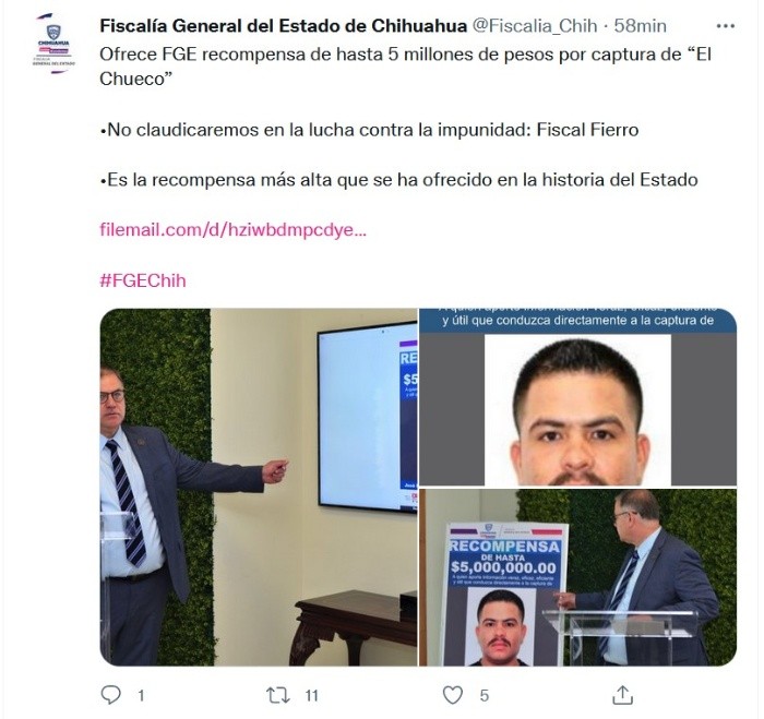 José Noriel Portillo, alias "El Chueco", identificado como el presunto homicida de los sacerdotes jesuitas Javier Campos Morales y Joaquín Mora Salazar, así como un guía de turistas, ha sido visto en las regiones chihuahuenses de Cerocahui, Bahuichivo, Porochi, Poblado Rodeo y Urique, informó esta tarde de miércoles la Secretaría de Seguridad y Protección Ciudadana.La dependencia informó que autoridades locales y federales activaron una célula de búsqueda para dar con el presunto líder regional de "Los Salazar", brazo armado del Cártel de Sinaloa, en la sierra sur chihuahuense, acusado del delito de homicidio calificado.Indicó que, por acuerdo del Gabinete de Seguridad Nacional, se mantiene desplegado un operativo especial para su búsqueda, en coordinación con autoridades estatales y municipales.La Fiscalía General del Estado de Chihuahua (FGE) ofrece una recompensa de hasta cinco millones de pesos a quien o quienes aporten información que conduzca directamente a la captura de José Noriel Portillo Gil, alias "El Chueco".De manera oficial, se confirmó que a este sujeto se le imputan los delitos de homicidio, delincuencia organizada, además es probable responsable de los hechos ocurridos el pasado 20 de junio, en la comunidad de Cerocahui, municipio de Urique.Autoridades estatales destacan que esta es la recompensa más grande que se ha ofrecido en Chihuahua, acción con la cual se le brinda voz a la sociedad, con el valor de la denuncia y colaboración ciudadana.JM