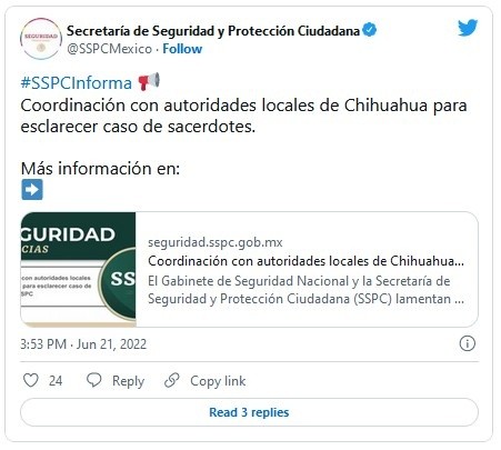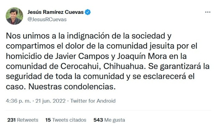 La Secretaría de Seguridad y Protección Ciudadana informó que ya se tiene identificado al responsable del asesinato de tres personas en una iglesia de Cerocahui en la sierra Tarahumara."Se informa que ya está identificado el responsable de los crímenes y se continúa con la investigación para dar con su paradero y no permitir la impunidad", señaló la dependencia en un comunicado.Asimismo, explicó que por órdenes del Presidente Andrés Manuel López Obrador, se estableció comunicación con las autoridades de Chihuahua para acordar la coordinación y apoyo que permitan la aprehensión del responsable y el esclarecimiento del caso.Tras el asesinato de dos sacerdotes jesuitas en la comunidad de Cerocahui, Chihuahua, Jesús Ramírez Cuevas, vocero de la Presidencia, aseguró que se garantizará la seguridad de toda la comunidad y se esclarecerá el caso.En su cuenta de Twitter, al enviar condolencias por los asesinatos, el vocero presidencial aseguró que el Gobierno federal se une a la indignación de la sociedad mexicana y comparte el dolor de la comunidad jesuita."Nos unimos a la indignación de la sociedad y compartimos el dolor de la comunidad jesuita por el homicidio de Javier Campos y Joaquín Mora en la comunidad de Cerocahui, Chihuahua"."Se garantizará la seguridad de toda la comunidad y se esclarecerá el caso. Nuestras condolencias", escribió el funcionario en la red social.JM
