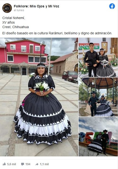 La joven Cristal Nohemí se volvió viral en redes sociales por elegir un hermoso y especial diseño para su vestido de XV años y con eso enaltecer sus raíces indígenas. A través de redes sociales se viralizaron fotografías de la joven posando con su vestido inspirando en la cultura rarámuri, a la que ella pertenece.La prenda es color negro con detalles en color blanco. Cristal complementó su atuendo con un pañuelo en la frente, con un diseño igual al del vestido, un ramo de lirios blancos y una faja tejida en color morado."Muy bonito vestido y ella hermosa", "Hermoso vestido, sigan conservando y fortaleciendo sus tradiciones", "Me quito el sombrero por portar dignamente un vestido con tradición", "Que original, muy bonito", fueron algunos de los comentarios que recibió la quinceañera, la mayoría acompañados de felicidades y buenos deseos por sus XV años.La joven es originaria de Creel, Chihuahua, y celebró sus quince primaveras el pasado fin de semana. De acuerdo con medios locales, el vestido fue confeccionado por una de sus tías.JM