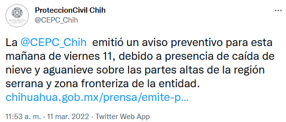 A días del inicio de la primavera se registró la caída de nieve y agua nieve, durante la mañana de este viernes en Ciudad Juárez, Chihuahua.La Coordinación Estatal de Protección Civil (CEPC) emitió un aviso preventivo, debido a la presencia de caída de nieve y aguanieve sobre las partes altas de la región serrana y zona fronteriza de la entidad.De acuerdo al pronóstico emitido, se presentó durante las primeras horas de este viernes la caída de agua nieve sobre el municipio de Juárez; cerca de las 9 horas se indicó el incremento de la precipitación en forma de nieve en gran parte del municipio.Estas condiciones se mantendrán hasta las 12 del mediodía, las cuales se disiparán a partir de las 13:00 horas.En municipios de Janos, Ascensión y Ahumada, mantienen la probabilidad lloviznas ligeras en próximas horas.Estas condiciones son generadas, debido al desplazamiento del Frente Frío número 35 sobre la entidad, donde se espera ambiente frío a muy frío.En el municipio de Juárez autoridades lanzaron alerta a la población debido a la disminución de la temperatura y ante las condiciones climáticas y la congelación del pavimento.El pasado 5 de febrero se registró otra nevada en la ciudad fronteriza así como en el resto de la entidad, debido al dente frío número 28.En Chihuahua, la Coordinación Estatal de Protección Civil informó que fueron al menos 19 los municipios los que en aquel entonces presentaron nevadas y bajas temperaturas, lo cual obligó al cierre de diversos tramos carreteros.No se han reportado cierres carreteros ni accidentes graves en a raíz de las condiciones climatológicas.OA