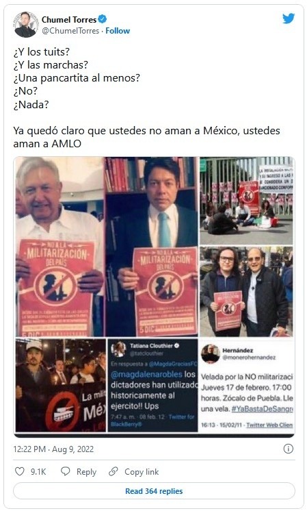 Luego de que el Presidente Andrés Manuel López Obrador anunciara el pasado 8 de agosto que emitirá un acuerdo presidencial para que la Guardia Nacional (GN) pase "completa" a la Secretaría de la Defensa Nacional (Sedena), y ya no a la Secretaría de Seguridad y Protección Ciudadana (SSPC), el comediante Chumel Torres criticó al Mandatario pues, dijo, "ustedes no aman a México, ustedes aman a AMLO".A través de Twitter, el creador de contenido recordó cuando los simpatizantes de la 4T estaban en contra de la militarización."¿Y los tuits? ¿Y las marchas? ¿Una pancartita al menos? ¿No? ¿Nada? Ya quedó claro que ustedes no aman a México, ustedes aman a AMLO", escribió el youtuber, acompañado de imágenes de figuras de la 4T estando en hechos pasados en contra de la militarización.En conferencia de prensa mañanera del pasado lunes, López Obrador adelantó que habrá una reestructuración por completo de la SSPC y ahora pase a ser la "Secretaría de Seguridad Pública y Justicia"."Les adelanto que ya por acuerdo de la Presidencia, pasa la seguridad que tiene que ver con la Guardia Nacional, completa, ya pasa a la Secretaría de la Defensa, ya la cuestión operativa está a cargo de la Secretaría de la Defensa".López Obrador manifestó que esta medida es para evitar que la Guardia Nacional se "eche a perder" como, asegura, pasó con la extinta Policía Federal (PF).JM