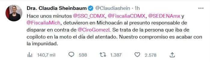 La jefa de gobierno, Claudia Sheinbaum, informó que fue detenido el presunto responsable de disparar en contra del periodista Ciro Gómez Leyva. Mediante un tuit, la funcionaria detalló que se trata del copiloto que iba en la motocicleta el día del atentado el pasado 15 de diciembre.De acuerdo con los hechos la detención fue en el estado de Michoacán. "Hace unos minutos @SSC_CDMX, @FiscaliaCDMX, @SEDENAmx y @FiscaliaMich, detuvieron en Michoacán al presunto responsable de disparar en contra de @CiroGomezL. Se trata de la persona que iba de copiloto en la moto el día del atentado. Nuestro compromiso es acabar con la impunidad", escribió.La fiscalía general de Justicia de la Ciudad de México informó de la detención de otras cuatro personas posiblemente ligadas al ataque armado contra el periodista Ciro Gómez Leyva. De acuerdo con los avances de la investigación, los elementos de seguridad realizaron dos cateos en Chalco y en Los Reyes, en el Estado de México, en donde se llevó a cabo la detención.En la Unidad Habitacional Tepozanes, en Los Reyes La Paz, se realizó la detención de Edgar "N" y Jenifer "N", en donde fueron asegurados 11 cartuchos útiles de 9 milímetros, 51 dosis con estupefacientes, además de un cargador de arma corta, documentos y 4 celulares.En la colonia Unión Guadalupe en Chalco Covarrubias se detuvo a Jesús Adrián "N" e Isaías "N", en el sitio se aseguraron 3 celulares, 227 bolsas con presunta marihuana y polvo blanco, así como 6 cartuchos de calibre 22, placas con reporte de robo, una camioneta color negro y un vehículo color blanco con rosa.De acuerdo a las investigaciones realizadas con el apoyo del Centro Nacional de Inteligencia del Gobierno de México, se pudo determinar que los 11 detenidos, por el ataque a Ciro Gómez Leyva, son parte de una célula criminal liderada por Pedro "N", alias "Pool". Las autoridades capitalinas confirmaron que dichas detenciones se llevaron a cabo tras 12 operativos simultáneos en 4 alcaldías: Gustavo A. Madero, Venustiano Carranza, Iztacalco e Iztapalapa. Los coordinadores de dicho grupo, ya detenidos, son Israel "N", Sergio David "N", Juan Antonio "N", Erick Hazael "N" y Daniela "N" quien fue identificada como la pareja sentimental del líder. También lee Hallan en Chalco auto usado como muro por sicarios en ataque a Ciro Gómez Leyva, confirma SSC; aún no hay móvil del ataque Los colaboradores detenidos son Tanya Jaqueline "N", Aniceto "N", Cinthia Yeyetci "N"" Elizabeth Mirella "N", "Junnuen Albeli "N".CR