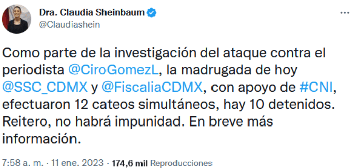 Claudia Sheinbaum, jefa de Gobierno de la Ciudad de México (CDMX), informó la mañana de este miércoles que hubo 12 cateos simultáneos en los que detuvieron a 10 personas, aunque más tarde se corregiría la cifra a 11 por el ataque al periodista Ciro Gómez Leyva del pasado 15 de diciembre.Sheinbaum escribió la mandataria capitalina en redes sociales:"Reitero, no habrá impunidad".Cabe mencionar que los cateos fueron realizados por la Secretaría de Seguridad Ciudadana y la Fiscalía General de Justicia y en apoyo con Centro Nacional de Inteligencia.Apenas en su mañanera del lunes 9 de enero, el Presidente Andrés Manuel López Obrador instruyó a las autoridades de la Ciudad de México a no dejar en caso del ataque al periodista."Estamos, también ahí en el caso de la ciudad, en la fiscalía, estamos pidiendo que se informe sobre el atentado a Ciro Gómez Leyva. No se nos va a olvidar eso, se tiene que seguir investigando. Y lo digo también porque quienes más nos ayudan son los ciudadanos, es la gente, siempre y, si tienen información, que nos ayuden para que salgamos todos adelante y nos cuidamos, y que haya tranquilidad, haya paz en nuestro país", dijo López Obrador.Más tarde, la fiscal de la CDMX, Ernestina Godoy ajustó el número de detenidos a 11, durante una conferencia de prensa.OA