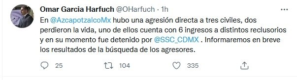 El secretario de Seguridad Ciudadana de la Ciudad de México, Omar García Harfuch, informó que en la alcaldía Azcapotzalco se registró una agresión directa a tres civiles, de los cuales dos perdieron la vida. Una mujer resultó herida.El funcionario señaló que uno de los sujetos cuenta con seis ingresos a distintos reclusorios y fue detenido anteriormente por la Secretaría de Seguridad Ciudadana."En @AzcapotzalcoMx hubo una agresión directa a tres civiles, dos perdieron la vida, uno de ellos cuenta con 6 ingresos a distintos reclusorios y en su momento fue detenido por @SSC_CDMX. Informaremos en breve los resultados de la búsqueda de los agresores.", escribió Gracía Harfuch en su cuenta de Twitter.De acuerdo con los primeros reportes, las tres personas viajaban en un vehículo color rojo cuando los tripulantes de una motocicleta color azul se acercaron y, de forma directa, les realizaron los disparos.El pasado 28 de enero, en medio de un operativo en un inmueble de la alcaldía Azcapotzalco señalado en investigaciones como un punto para la venta de drogas, delincuentes se enfrentaron con policías capitalinos dejando como saldo cuatro personas muertas, dos uniformados de la SSC y dos delincuentes armados.JM