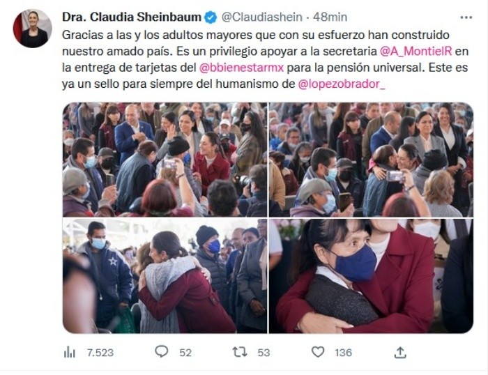 Al encabezar la entrega de mil tarjetas del Bienestar de la Pensión de Adultos Mayores a nuevos derechohabientes de la alcaldía Venustiano Carranza, la Jefa de Gobierno de la Ciudad de México, Claudia Sheinbaum, resaltó que el apoyo ahora se entrega a través del Banco del Bienestar y que esta institución bancaria pública tendrá más cajeros que otros bancos."El Banco del Bienestar va a ser el banco que más cajeros tenga de todos, incluida la banca privada; pero, además, es bueno, porque finalmente ese dinero que es del pueblo se queda en un banco del pueblo, para distribuir los recursos que son para el pueblo. Esa es la virtud del Banco del Bienestar", comentó.Sheinbaum explicó que, para el próximo año, el Presidente Andrés Manuel López Obrador prevé que el apoyo aumente todavía más, a seis mil pesos bimestrales para 2024."Aumenta la pensión este año y va a aumentar en el 24. El Presidente quiere que sea de seis mil pesos bimestrales para el próximo año, para el 2024, o sea, nos va a dejar un gran regalo en el último año de su gobierno", dijo.Por su parte, la secretaria del Bienestar del Gobierno de México, Ariadna Montiel, indicó que en el mes de enero se entregarán 40 mil tarjetas a nuevos derechohabientes de la Pensión del Bienestar para Adultos Mayores."En el padrón general de la ciudad, estamos llegando a un millón 250 mil derechohabientes de la pensión adulto mayor. Este año se incrementa 25 por ciento la pensión y el monto bimestral que se va a recibir es de cuatro mil 800 pesos", comentó.Además, Montiel explicó que el organismo a su cargo está realizando varios procesos a la vez, por lo que el próximo lunes 9 de enero, continúa la migración de las tarjetas de distintos bancos a la tarjeta del Bienestar, en 33 módulos en la ciudad y que están distribuidos en las 16 alcaldías de la ciudad.En tanto, recordó que en este mes de enero, la pensión para los adultos mayores se depositará de acuerdo con la primera letra del apellido, pues señaló que a nivel nacional son 11 millones 56 mil beneficiarios, por lo que los bancos se llegan a saturar."Convenimos que la dispersión se hiciera en un calendario por letras, durante cinco días, que no solo fuera en día, para permitir que los bancos tuvieran mejor atención para los derechohabientes", comentó.JM