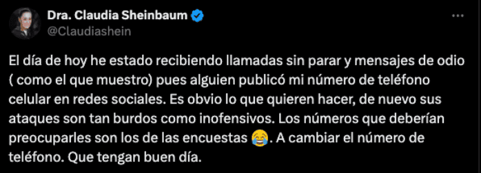 La candidata presidencial por la coalición “Sigamos Haciendo Historia” Claudia Sheinbaum, denunció este sábado que su número de teléfono fue filtrado en redes sociales y por ello ha estado recibiendo mensajes de odio en su celular.A través de su cuenta de X, Sheinbaum señaló que “el día de hoy he estado recibiendo llamadas sin parar y mensajes de odio ( como el que muestro) pues alguien publicó mi número de teléfono celular en redes sociales".La exjefa de Gobierno de la Ciudad de México, acompañó el texto de la publicación con una imagen en la que una persona señala no ser robot y asegura que la candidata del gobernante Movimiento Regeneración Nacional (Morena) y sus aliados, los Partidos del Trabajo (PT) y Verde Ecologista de México (PVEM) no lo representa."Quiere echarle la culpa a alguien, acuda a Palacio y quéjese con su patrón", concluye el texto mostrado por Sheinbaum.La aspirante presidencial calificó los ataques "tan burdos como inofensivos"."Los números que deberían preocuparles son los de las encuestas . A cambiar el número de teléfono. Que tengan buen día", puntualizó.La divulgación del número telefónico de Sheinbaum ocurre apenas unas horas después de que el hijo mayor del Presidente, Andrés Manuel López Obrador, José Ramón, denunciará en redes sociales que la información de su celular fue filtrado también.Además se da en medio de la controversia originada por el mandatario mexicano quien exhibió una carta de la corresponsal del diario The New York Times, Natalie Kitroeff con su teléfono.En dicha misiva, la periodista le pedía su respuesta sobre una investigación de Estados Unidos, cerrada ahora, de supuestos sobornos del Cártel de Sinaloa y del Cártel de los Zetas que recibió la campaña de López Obrador en 2018 y que involucraba también a sus hijos.La difusión de la información privada de la periodista desató una investigación del Instituto Nacional de Transparencia, Acceso a la Información y Protección de Datos Personales (Inai), además de un pronunciamiento de The New York Times y críticas de organizaciones como el Comité de Protección a Periodistas (CPJ), que coincidieron en el riesgo que esto representa en México, uno de los países con más asesinatos de comunicadores.Sin embargo, López Obrador desestimó la investigación del Inai y defendió haber divulgado los datos de la periodista.Durante el sexenio de López Obrador (2018-2024), al menos 69 periodistas han muerto asesinados, según recordó la organización Propuesta Cívica tras la controversia.NA