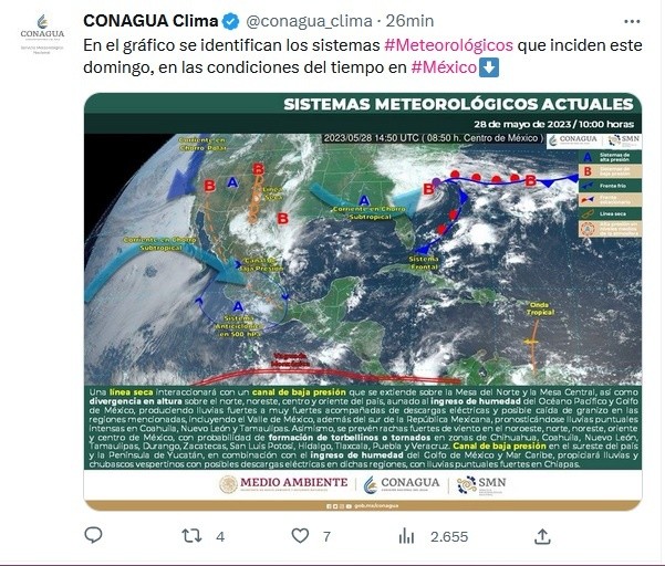 Para este domingo se prevén lluvias intensas y habrá condiciones para torbellinos o tornados en Coahuila, Nuevo León y Tamaulipas.Una línea seca en el norte de la República Mexicana, un canal de baja presión que se extenderá desde la Mesa del Norte hasta el sur país y una amplia área de inestabilidad en la atmósfera superior propiciarán lluvias puntuales intensas, granizadas y rachas de viento de 60 a 80 kilómetros por hora (km/h) con posibles torbellinos o tornados en regiones de Coahuila, Nuevo León y Tamaulipas.En zonas de Chihuahua, Durango y Zacatecas también se prevén condiciones para torbellinos o tornados. De acuerdo con información de la Conagua, también se pronostican lluvias puntuales muy fuertes en regiones de la Ciudad de México, Estado de México, Morelos, Oaxaca, Puebla y Tlaxcala; fuertes en zonas de Chiapas, Chihuahua, Durango, Guerrero, Hidalgo, Michoacán y Veracruz; intervalos de chubascos en Guanajuato, Querétaro, Quintana Roo, San Luis Potosí, Yucatán y Zacatecas, así como lluvias aisladas en Campeche, Colima, Jalisco y Tabasco.Este domingo se mantendrá el ambiente de caluroso a muy caluroso en los Estados del Pacífico mexicano.Para la Península de Yucatán y el sureste del país, se pronostican temperaturas máximas de 40 a 45 grados Celsius en Campeche, Chiapas, Guerrero, Jalisco, Michoacán, Oaxaca, Quintana Roo, Tabasco, Veracruz y Yucatán.Asimismo, se prevén valores de 35 a 40 grados Celsius en Baja California, Baja California Sur, Colima, Nayarit, San Luis Potosí, Sinaloa, Sonora y Tamaulipas, y de 30 a 35 grados Celsius en Aguascalientes, Chihuahua, Coahuila, Durango, suroeste del Estado de México, Guanajuato, Hidalgo, Morelos, Nuevo León, suroeste Puebla, Querétaro y Zacatecas.Se recomienda a la población tomar medidas preventivas como evitar la exposición prolongada a la radiación del Sol, hidratarse adecuadamente, poner especial atención a enfermos crónicos, niños y adultos mayores, así como atender las indicaciones del sector salud y de Protección Civil. JM