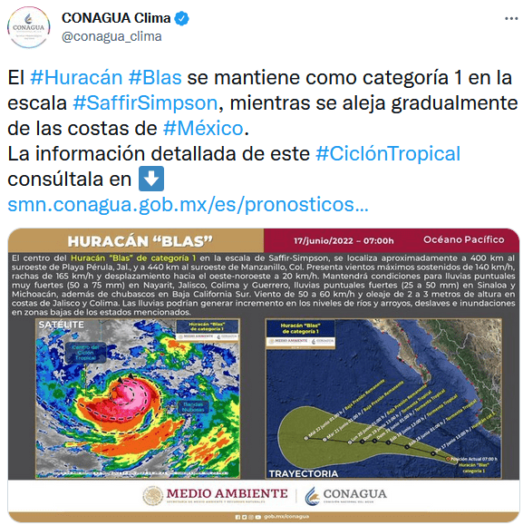 La Comisión Nacional de Agua (Conagua) informó de la formación de la depresión tropical Tres-E, que a su vez podría generar a "Celia"."Celia" podría convertirse en tormenta tropical hoy a las 13:00 horas y se mantenga así hasta el miércoles 22 de junio 2022.Se pronostican lluvias puntuales intensas en regiones de Chiapas, Quintana Roo y Tabasco; muy fuertes (de 50 a 75 mm) en zonas de Campeche, Colima, Jalisco, Nayarit, Oaxaca, Veracruz y Yucatán; fuertes (de 25 a 50 mm) en áreas de Durango, Guerrero, Michoacán, Puebla, Sinaloa y Sonora; intervalos de chubascos (5 a 25 mm) en Baja California Sur, Chihuahua, Ciudad de México, Estado de México, Guanajuato, Hidalgo, Morelos, Querétaro, San Luis Potosí, Tamaulipas y Tlaxcala, y lluvias aisladas (de 0.1 a 5 mm) en Aguascalientes, Nuevo León y Zacatecas.Sin embargo, en la Ciudad de México se sentirán los efectos de "Celia". Para este viernes 17 de junio 2022 habrá cielo nublado, con un 80% de potencial de lluvias y una temperatura máxima de 25°.Para el sábado 18 de junio el panorama será semejante, pues habrá cielo nublado, con un 80% de potencial de lluvias y una temperatura máxima de 24°.Y para el domingo 18 de junio habrá cielo nublado, con un 80% de potencial de lluvias y una temperatura máxima de 23°.OA