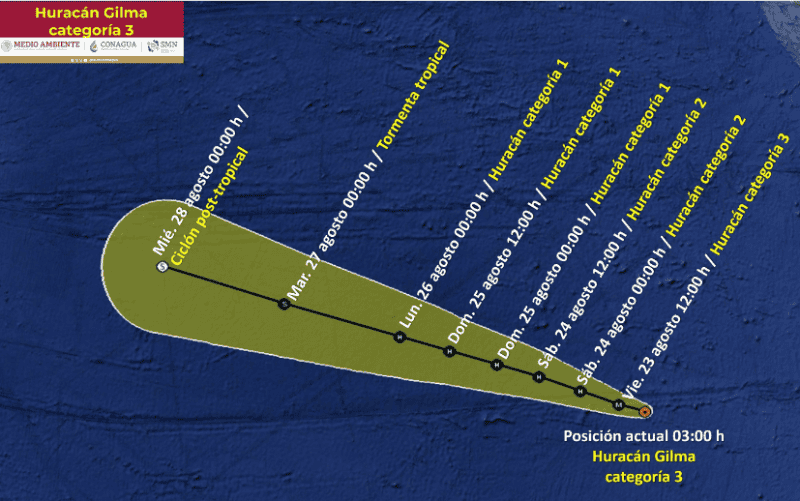 El Servicio Meteorológico Nacional (SMN), fuente climática oficial del Gobierno de México, informó este viernes que el huracán "Gilma" se encuentra muy lejos de costas nacionales.La situación actual del ciclón, señaló el SMN, es que "Gilma" se mantiene como huracán categoría 3 en la escala de Saffir-Simpson. Muy lejos de costas mexicanas.En su distancia al lugar más cercano, el ciclón permanece a 1,795 km al oeste-suroeste de Cabo San Lucas, Baja California Sur.Su desplazamiento actual es hacia el oeste-noroeste (290°) a 9 km/h. Mantiene vientos máximos sostenidos de 195 km/h y rachas de 240 km/h.Se espera que "Gilma" baje de categoría a partir de mañana y así, sucesivamente, hasta que se una tormenta tropical el próximo martes 27 de agosto, ya muy al interior del Océano Pacífico.Por la mañana, ambiente fresco y templado en zonas costeras, además de bancos de niebla en zonas altas. Cielo medio nublado y lluvias aisladas en la región. Durante la tarde, ambiente cálido, principalmente en zonas de costa. Cielo nublado con lluvias puntuales intensas en Nayarit y Jalisco, así como muy fuertes en Colima y Michoacán, todas con descargas eléctricas y posible caída de granizo; las cuales podrían reducir la visibilidad, ocasionar inundaciones, encharcamientos y deslaves, así como incrementar los niveles de ríos y arroyos. Viento de dirección variable de 10 a 25 km/h, con rachas de 40 km/h en zonas de tormenta.Temperaturas máximas de 40 a 45 °C: Baja California, Baja California Sur, Sonora, Sinaloa, Chihuahua, Coahuila, Nuevo León y Tamaulipas.Temperaturas máximas de 35 a 40 °C: Durango, Nayarit, Jalisco, Oaxaca, Chiapas, Veracruz, Tabasco, Campeche, Yucatán y Quintana Roo.Temperaturas máximas de 30 a 35 °C: Colima, Michoacán, Guerrero, Zacatecas, San Luis Potosí, Puebla (suroeste) y Morelos.Con información del Servicio Meteorológico Nacional* * * Mantente al día con las noticias, únete a nuestro canal de WhatsApp * * *MS