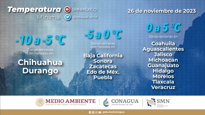 Se desplazará sobre el norte y noreste de la República Mexicana, en interacción con las corrientes en chorro polar y subtropical, y con un canal de baja presión en el oriente y sureste del territorio mexicano.Este es el pronóstico de temperaturas mínimas para este domingo 26 de noviembre en diferentes estados de México: *Mantente al día con las noticias, únete a nuestro canal de WhatsApp aquí: https://whatsapp.com/channel/0029VaAf9Pu9hXF1EJ561i03MV
