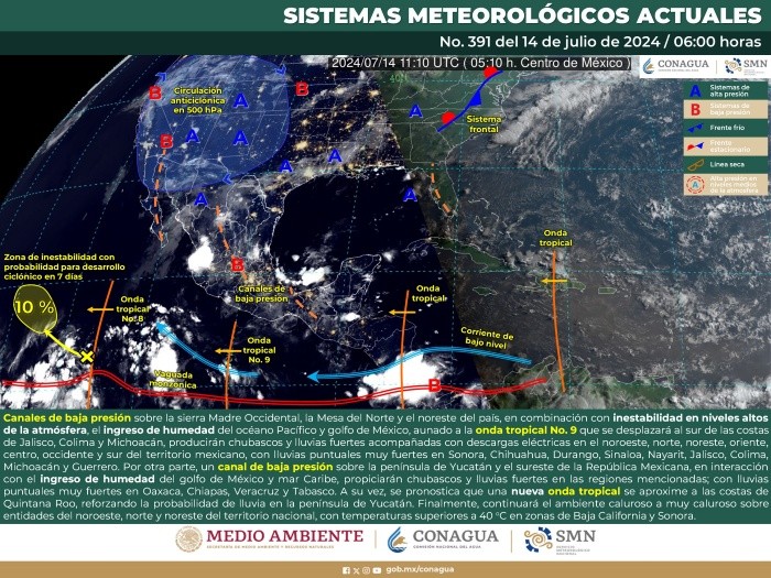El Servicio Meteorológico Nacional, pronostica para este domingo, que canales de baja presión sobre la sierra Madre Occidental, la Mesa del Norte y el noreste del país, en combinación con inestabilidad en niveles altos de la atmósfera, el ingreso de humedad del océano Pacífico y golfo de México, aunado a la onda tropical 9 que se desplazará al sur de las costas de Jalisco, Colima y Michoacán.Se producirán chubascos y lluvias fuertes acompañadas con descargas eléctricas en el noroeste, norte, noreste, oriente, centro, occidente y sur del territorio mexicano.Se esperan lluvias puntuales muy fuertes en Sonora, Chihuahua, Durango, Sinaloa, Nayarit, Jalisco, Colima, Michoacán y Guerrero. Por otra parte, un canal de baja presión sobre la península de Yucatán y el sureste de la República Mexicana, en interacción con el ingreso de humedad del golfo de México y mar Caribe, propiciarán chubascos y lluvias fuertes en las regiones mencionadas; con lluvias puntuales muy fuertes en Oaxaca, Chiapas, Veracruz y Tabasco. A su vez, se pronostica que una nueva onda tropical se aproxime a las costas de Quintana Roo, reforzando la probabilidad de lluvia en la península de Yucatán. Finalmente, continuará el ambiente caluroso a muy caluroso sobre entidades del noroeste, norte y noreste del territorio nacional, con temperaturas superiores a 40 °C en zonas de Baja California y Sonora.*Mantente al día con las noticias, únete a nuestro canal de WhatsApp aquí: https://whatsapp.com/channel/0029VaAf9Pu9hXF1EJ561i03 MV