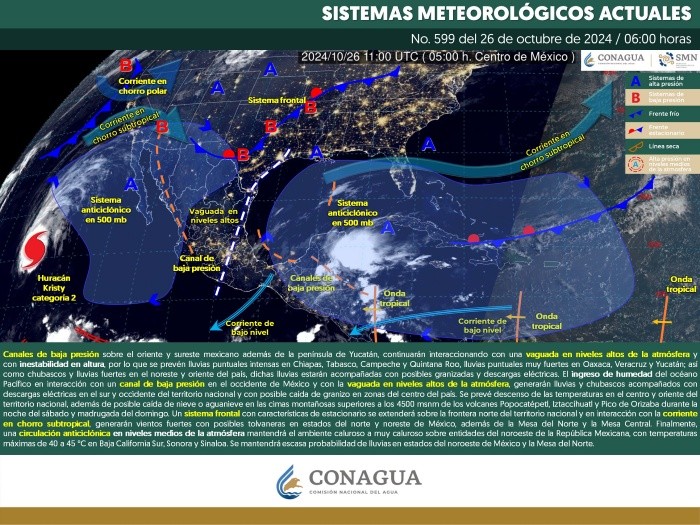 Para este sábado 26 de octubre de 2024, según el Servicio Meteorológico Nacional (SMN), se esperan condiciones del clima variables en México debido a la interacción de distintos fenómenos. Canales de baja presión sobre el oriente y sureste del país, así como la península de Yucatán, continuarán influyendo en el estado del tiempo, al combinarse con una vaguada en niveles altos de la atmósfera y la inestabilidad en altura, situación que dará lugar a lluvias intensas en algunas regiones, además de posibles granizadas y descargas eléctricas.Se prevén lluvias puntuales intensas en los estados de Chiapas, Tabasco, Campeche y Quintana Roo, indica el pronóstico de la dependencia de la Comisión Nacional del Agua (Conagua). Por su parte, Oaxaca, Veracruz y Yucatán experimentarán lluvias puntuales muy fuertes. En el noreste y oriente del territorio nacional también se esperan chubascos y lluvias fuertes, acompañadas de granizo y actividad eléctrica.En el occidente y sur de México, la entrada de humedad del océano Pacífico, en combinación con un canal de baja presión y una vaguada en niveles altos de la atmósfera, generará lluvias y chubascos. Estas precipitaciones estarán acompañadas de descargas eléctricas y, en algunas zonas del centro del país, podrían presentarse granizadas.El SMN informa que se pronostica un descenso en las temperaturas en el centro y oriente de México. Durante la noche del sábado y la madrugada del domingo, además del ambiente frío, existe la posibilidad de nevadas o caída de aguanieve en las cimas montañosas superiores a los 4 mil 500 metros sobre el nivel del mar, es decir, en los volcanes Popocatépetl, Iztaccíhuatl y Pico de Orizaba.Un sistema frontal estacionario se extenderá sobre la frontera norte, interactuando con la corriente en chorro subtropical, lo que provocará vientos fuertes y posibles tolvaneras en el norte y noreste del país, así como en la Mesa del Norte y la Mesa Central.Finalmente, una circulación anticiclónica en niveles medios de la atmósfera mantendrá un ambiente caluroso a muy caluroso en el noroeste de México, con temperaturas máximas de 40 a 45 °C en Baja California Sur, Sonora y Sinaloa. Además, la probabilidad de lluvias en estas regiones y la Mesa del Norte será baja.*Mantente al día con las noticias, únete a nuestro canal de WhatsApp OF