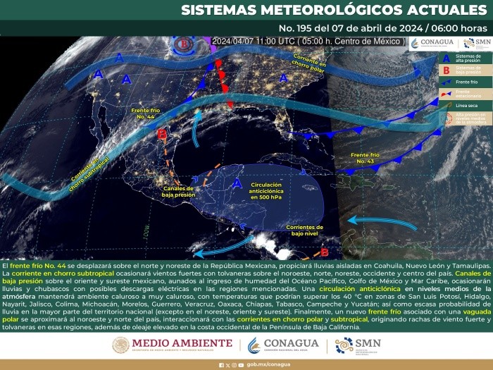 Para este domingo, el frente frío número 44 se desplazará sobre el norte y noreste de la República Mexicana, según el Servicio Meteorológico Nacional, esto propiciará lluvias aisladas en Coahuila, Nuevo León y Tamaulipas. La corriente en chorro subtropical ocasionará vientos fuertes con tolvaneras sobre el noroeste, norte, noreste, occidente y centro del país. Se esperan canales de baja presión sobre el oriente y sureste mexicano, aunados al ingreso de humedad del Océano Pacífico, Golfo de México y Mar Caribe, ocasionarán lluvias y chubascos con posibles descargas eléctricas en las regiones mencionadas. Una circulación anticiclónica en niveles medios de la atmósfera mantendrá ambiente caluroso a muy caluroso, con temperaturas que podrían superar los 40 °C en zonas de San Luis Potosí, Hidalgo, Nayarit, Jalisco, Colima, Michoacán, Morelos, Guerrero, Veracruz, Oaxaca, Chiapas, Tabasco, Campeche y Yucatán; así como escasa probabilidad de lluvia en la mayor parte del territorio nacional (excepto en el noreste, oriente y sureste). Además, un nuevo frente frío asociado con una vaguada polar, se aproximará al noroeste y norte del país, interaccionará con las corrientes en chorro polar y subtropical, originando rachas de viento fuerte y tolvaneras en esas regiones, además de oleaje elevado en la costa occidental de la Península de Baja California. MV