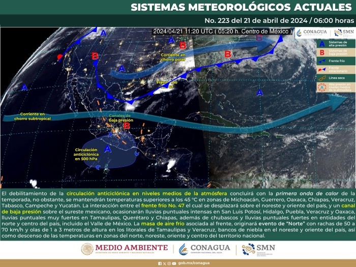 Para este domingo, el Servicio Meteorológico Nacional pronostica que el debilitamiento de la circulación anticiclónica en niveles medios de la atmósfera concluirá con la primera onda de calor de la temporada, no obstante, se mantendrán temperaturas superiores a los 45 °C en zonas de Michoacán, Guerrero, Oaxaca, Chiapas, Veracruz, Tabasco, Campeche y Yucatán. Por otra parte, la interacción entre el frente frío número 47, el cual se desplazará sobre el noreste y oriente del país, y un canal de baja presión sobre el sureste mexicano, ocasionarán lluvias puntuales intensas en San Luis Potosí, Hidalgo, Puebla, Veracruz y Oaxaca, lluvias puntuales muy fuertes en Tamaulipas, Querétaro y Chiapas, además de chubascos y lluvias puntuales fuertes en entidades del norte y centro del país, incluido el Valle de México.Se espera que estas lluvias estén acompañadas de descargas eléctricas, posible caída de granizo y podrían originar el incremento en niveles de ríos y arroyos, encharcamientos, deslaves e inundaciones. *Mantente al día con las noticias, únete a nuestro canal de WhatsApp aquí: https://whatsapp.com/channel/0029VaAf9Pu9hXF1EJ561i03MV