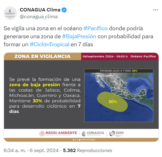 Este viernes 6 de septiembre, el Servicio Meteorológico Nacional (SMN), dependencia de la Comisión Nacional del Agua (Conagua) informó que se vigila una zona en el océano Pacífico, donde podría generarse una zona de Baja Presión, con probabilidad del 30% de formar un ciclón tropical en los próximos 7 días.Por su parte, el Centro Nacional de Huracanes (NHC, por sus siglas en inglés) de Estados Unidos, pronostica que mar adentro al suroeste de México se formará un área de baja presión a mediados de la próxima semana frente a la costa del sur o el suroeste de México. Señala que las condiciones ambientales podrían apoyar el desarrollo gradual de este ciclón, mientras se mueve generalmente hacia el oeste-noroeste, aproximadamente paralelo a la costa del suroeste del país.El NHC indica que este fenómeno tiene 0% de probabilidad de formación en 48 horas, sin embargo, que es del 30% en 7 días.El temporal de lluvias inició en México, en la cuenca del Pacífico, el pasado 15 de mayo, mientras que en Atlántico el 1 de junio. En ambos litorales termina el 30 de noviembre, aunque las precipitaciones pueden llegar antes o después.De acuerdo con información del "Atlas climatológico de ciclones tropicales en México" del Centro Nacional de Prevención de Desastres (Cenapred), México se ve históricamente afectado por ciclones tropicales desde el inicio de la temporada, aunque los meses de julio, agosto y septiembre son los que presentan el mayor número de estos.De estos tres meses es septiembre cuando se presenta la mayor cantidad de ciclones que afectan directamente las costas. En octubre la tendencia baja, y para noviembre ya son pocos los fenómenos de este tipo los que pueden presentarse, aunque la posibilidad de que se originen y afecten el territorio todavía existe, por lo que sí podría aumentar la posibilidad de que se forme un ciclón este mes, lo que ha sido muy bajo en los anteriores.*Mantente al día con las noticias, únete a nuestro canal de WhatsAppOF