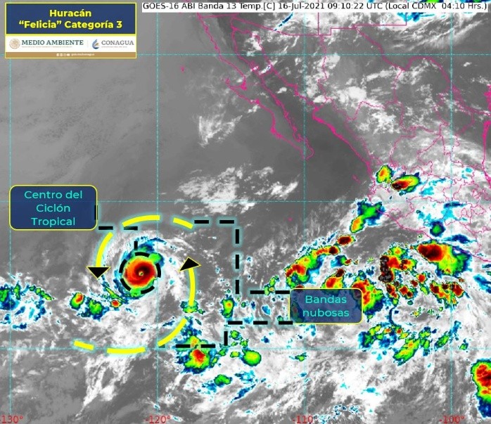 El ciclón "Felicia" tomó fuerza y subió a huracán categoría 3 en el Océano Pacífico, ubicándose muy lejos de las costas mexicanas por lo que no genera peligro, informó este viernes el Servicio Meteorológico Nacional (SMN)."El huracán "Felicia" se intensificó a categoría 3 en la escala Saffir-Simpson y se localiza al suroeste de las costas de Baja California Sur, lejos de territorio mexicano", informó el organismo en su reporte más reciente.A las 04.00 hora local, el ciclón se situaba a mil 410 kilómetros al suroeste de Cabo San Lázaro, en Baja California Sur.El fenómeno se desplaza a 15 kilómetros por hora hacia el oeste y registra vientos sostenidos de 185 kilómetros por hora con rachas de hasta 220 kilómetros por hora.Por su lejanía "no representa peligro para el territorio mexicano", puntualizó el organismo.Según el pronóstico del Meteorológico, el ciclón se mantendrá en categoría 3 hasta este sábado y luego perderá fuerza, mientras se aleja todavía más de las costas.La temporada de lluvias y ciclones tropicales 2021 en el Pacífico comenzó oficialmente el pasado 15 de mayo y se estima que finalice en noviembre.La Comisión Nacional del Agua (Conagua), de la que depende el Sistema Meteorológico, pronosticó en mayo pasado la formación de entre 14 y 20 sistemas con nombre en el océano Pacífico para esta temporada, mientras que para el Atlántico previó de 15 a 19 fenómenos.GC