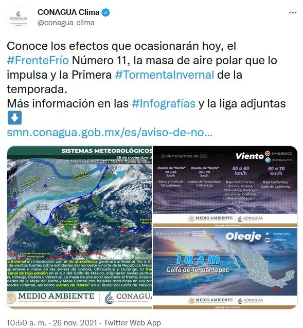 En las próximas tres horas, el Servicio Meteorológico espera lluvias con descargas eléctricas en zonas del noroeste, norte y noreste de México. En algunas zonas, las lluvias podrían acompañarse de rachas fuertes de viento.Para hoy viernes, el frente frío número 11 recorrerá el noreste y oriente del país, extendiéndose por la tarde sobre el Golfo de México hasta el sur de Veracruz, ocasionará lluvias fuertes a muy fuertes en Tamaulipas, San Luis Potosí, Puebla, Veracruz, Hidalgo, Oaxaca, Chiapas y Tabasco.La masa de aire polar asociada a dicho frente provocará ambiente muy frío con heladas al amanecer sobre el noreste, oriente y centro del territorio nacional, nieblas en zonas serranas de dichas regiones, además de evento de "Norte" con rachas de 70 a 80 km/h en el Istmo y Golfo de Tehuantepec, así como de 50 a 70 km/h en las costas de Tamaulipas y Veracruz.Por otra parte, la Primera Tormenta Invernal, en interacción con el abundante ingreso de humedad generado por el río atmosférico, propiciará ambiente muy frío, heladas matutinas, lluvias y vientos fuertes sobre el noroeste y norte de la República Mexicana, así como probabilidad para la caída de aguanieve o nieve en sierras de Sonora, Chihuahua y Durango.Sinaloa, Nayarit, Jalisco, Colima, Michoacán, Guerrero, Oaxaca y Chiapas llegarán a los 40 °C.Las zonas montañosas de Chihuahua y Durango llegarán a -10 a -5 °C.OA