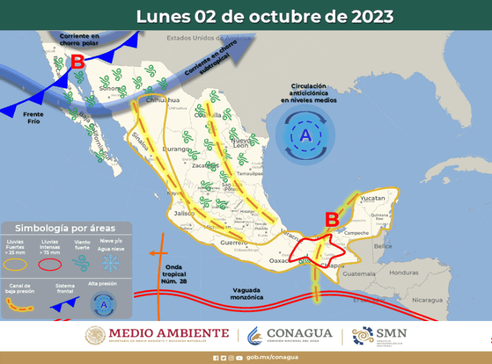 El Servicio Meteorológico Nacional (SMN), fuente climática oficial del Gobierno de México en materia climática, anunció desde ayer el ingreso de un nuevo frente frío al territorio nacional este sábado.A través de su pronóstico de ayer, el SMN señalaba que desde hoy y hasta el domingo, se anticipa un temporal de lluvias muy fuertes a intensas sobre la península de Yucatán y sureste mexicano, debido a un sistema de baja presión en interacción con la onda tropical número 28, un canal de baja presión e inestabilidad en niveles altos de la atmósfera.Durante la tarde-noche, un nuevo frente frío, asociado con la corriente en chorro polar, arribará al noroeste del país, originando lluvias aisladas en Baja California, así como vientos de 60 a 80 km/h y posibles tolvaneras en Baja California, Sonora y Chihuahua. Lluvias el sábado 30 de septiembre:Lluvias domingo 01 de octubre:Lluvias lunes 02 de octubre:Con información del Servicio Meteorológico NacionalOA