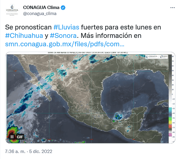 Para este lunes 5 de diciembre, la entrada de humedad generada por la corriente en chorro subtropical, ocasionará lluvias puntuales fuertes en Sonora y Chihuahua, además de chubascos en la Península de Baja California.De acuerdo con información del Servicio Meteorológico Nacional de Conagua, la aproximación de un sistema frontal al noroeste del país, en interacción con una línea seca que se establecerá al norte de Coahuila, ocasionará fuertes rachas de viento en el noroeste y norte de México.Por su parte, un canal de baja presión sobre el sureste mexicano, generará lluvias y chubascos acompañados de descargas eléctricas en Veracruz, Oaxaca y Chiapas.Finalmente, una circulación anticiclónica en niveles medios de la atmósfera propiciará ambiente cálido en gran parte del territorio nacional.OF
