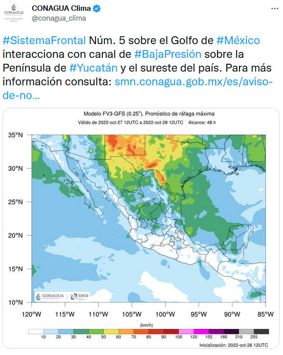 Este jueves se prevé la entrada de un nuevo frente frío sobre el noroeste y norte del país.De acuerdo con el reporte del Servicio Meteorológico Nacional de Conagua, este jueves el frente frío número 5 se extenderá con características cálidas sobre el Golfo de México, sin afectar a la República Mexicana.Por otra parte, un nuevo frente frío ingresará sobre el noroeste y norte de México, interaccionará con una vaguada polar y con la corriente en chorro subtropical, originando fuertes rachas de viento y posibles tolvaneras en dicha región, además de probables chubascos en zonas de Coahuila.Por otra parte, un canal de baja presión se extenderá en el interior del país, en interacción con inestabilidad en niveles altos de la atmósfera y con la entrada de humedad del Golfo de México, generarán lluvias e intervalos de chubascos en zonas del noreste, oriente, centro, occidente y sur del territorio nacional.Un segundo canal de baja presión en el sureste mexicano y la entrada de humedad del Mar Caribe, propiciarán lluvias e intervalos de chubascos en dicha región, incluida la Península de Yucatán. Dichas lluvias podrían estar acompañadas de descargas eléctricas, rachas de viento y posible caída de granizo.Finalmente, continuará el ambiente frío al amanecer sobre estados de la Mesa del Norte y con posibles heladas en sierras de Chihuahua y Durango.Intervalos de chubascos: Coahuila, Tamaulipas, Michoacán, Guerrero, Morelos, Ciudad de México, Estado de México, Tlaxcala, Puebla, Veracruz, Oaxaca, Chiapas y Quintana Roo.Lluvias aisladas: Nuevo León, San Luis Potosí, Hidalgo, Jalisco, Colima, Tabasco, Campeche y Yucatán.OA