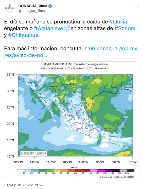 Hoy martes 6 de diciembre persiste la entrada de humedad por una corriente en chorro subtropical que chocará con una vaguada polar desde el noreste de México, esto generará lluvias puntuales fuertes en Sonora y Chihuahua. También durante la noche y madrugada se espera la caída de lluvia engelante o aguanieve en ambos estados y en Baja California.De acuerdo con Servicio Meteorológico Nacional (SMN) de la Comisión Nacional del Agua (Conagua), canales de baja presión sobre el centro y sureste del país, en combinación con la entrada de humedad de ambos océanos, originarán lluvias e intervalos de chubascos que podrían acompañarse de descargas eléctricas en zonas del occidente, sur, sureste y Península de Yucatán.Una circulación anticiclónica en niveles medios de la atmósfera, ocasionará baja probabilidad de lluvia en la mayor parte del territorio mexicano, así como ambiente frío a muy frío durante la mañana y noche sobre entidades de la Mesa del Norte y la Mesa Central, además de heladas en zonas montañosas.***OF