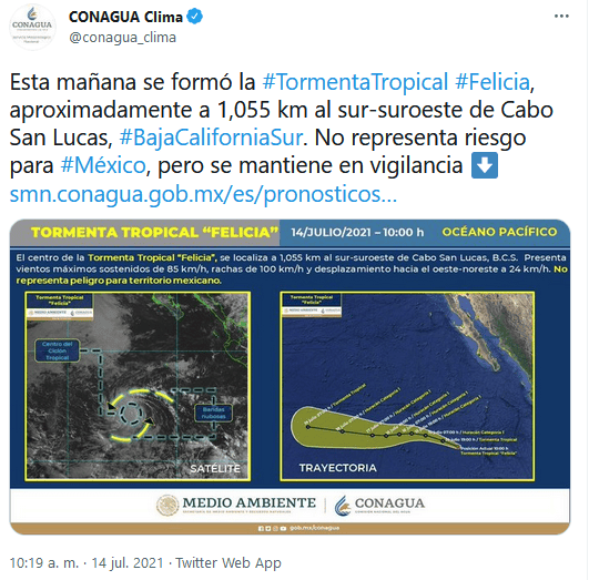 La tormenta tropical "Felicia" se formó en las últimas horas en el océano Pacífico y se ubica muy lejos de las costas mexicanas por lo que no genera peligros, informó este miércoles el Servicio Meteorológico Nacional (SMN) de México."Durante esta mañana la depresión tropical Seis-E se ha intensificado a la tormenta tropical "Felicia", su centro se localiza al suroeste de las costas de Baja California Sur, lejos de costas mexicanas", informó el organismo en su reporte más reciente.A las 10.00 hora local, el ciclón se situaba 1.055 kilómetros al sur-suroeste de Cabo San Lucas, en Baja California Sur.El fenómeno se desplaza a 24 kilómetros por hora hacia el oeste-noroeste y registra vientos sostenidos de 85 kilómetros por hora con rachas de hasta 100 kilómetros por hora.Por su lejanía "no representa peligro para el territorio mexicano", puntualizó el organismo.Según el pronóstico del Meteorológico, el ciclón ganará fuerza en las próximas horas y llegará a ser de categoría 1, mientras se aleja todavía más de las costas.La temporada de lluvias y ciclones tropicales de 2021 en el Pacífico comenzó oficialmente el pasado 15 de mayo y se estima que finalice en noviembre.Por el momento, se han formado en el Pacífico los ciclones "Andrés", "Blanca", "Carlos", "Dolores", "Enrique" y "Felicia".Dolores tocó tierra, el pasado 19 de junio, e impactó especialmente en los estados de Colima y Michoacán y dejó tres muertos por tormentas eléctricas.Mientras que por el Atlántico se han registrado hasta cinco ciclones: "Ana", "Bill", "Claudette", "Danny" y "Elsa".La Comisión Nacional del Agua (Conagua), de la que depende el Sistema Meteorológico, pronosticó en mayo pasado la formación de entre 14 y 20 sistemas con nombre en el Océano Pacífico para esta temporada, mientras que para el Atlántico previó de 15 a 19 fenómenos.GC