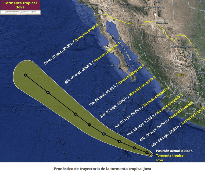 La tormenta tropical "Jova" finalmente se formó este martes, a partir de la depresión tropical ONCE-E, en el Océano Pacífico, frente a las costas de Michoacán; según un aviso elaborado por el Servicio Meteorológico Nacional (SMN), fuente oficial del Gobierno de México en materia climática.La tormenta tropical "Jova" se encuentra, en su distancia al lugar más cercano, a 715 km al sur-suroeste de Punta San Telmo, Michoacán, y a mil 165 al sur-sureste de Cabo San Lucas, Baja California Sur. El SMN informó que el sistema no afecta al territorio nacional."Jova" se desplaza hacia el oeste (280°) a 19 km/h y mantiene vientos máximos sostenidos de 65 km/h y rachas de 85 km/h.De acuerdo al pronóstico, se prevé que sea mañana alrededor del mediodía cuando "Jova" incremente su fuerza y alcance la categoría 1 como huracán, cuando se encuentre a 480 km al sur de Isla Socorro, Colima.Sería el viernes 8 de setiembre cuando tendría la categoría 3 como huracán, lo máximo que alcanzaría según la previsión. "Jova" es el décimo sistema del presente temporal. La temporada de huracanes inició en México desde el pasado 15 de mayo y prevé, en el Océano Pacífico, de 16 a 22 sistemas hidrometeorológicos.Con información del Servicio Meteorológico NacionalOA