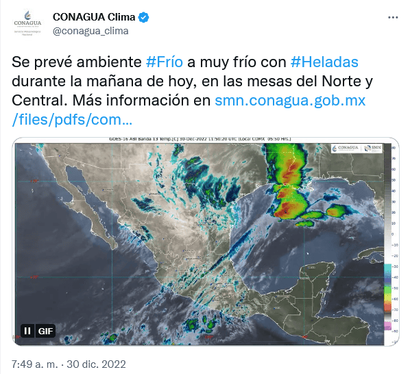 Para este viernes 30 de diciembre, el Frente Frío Número 20 se desplazará hacia el sur de Estados Unidos, pero la vaguada polar y el ingreso de humedad generada por la corriente en chorro polar, originará lluvias e intervalos de chubascos, así como fuertes rachas de viento con tolvaneras en el noroeste y norte de México.Además, continúa el ambiente frío a muy frío con heladas al amanecer sobre los estados de la Mesa del Norte y Mesa Central, gélido en zonas montañosas de Chihuahua y Durango.También se prevé la caída de aguanieve o nieve en las sierras de Sonora, Chihuahua, Durango, Zacatecas y Coahuila.Por otra parte, el ingreso de humedad del Océano Pacífico, Golfo de México y Mar Caribe, ocasionará lluvias aisladas en el centro, sur y sureste del país, además de la Península de Yucatán.Mientras que el ingreso del Frente Frío Número 21, que entrará por Tamaulipas, tocará la corriente en chorro subtropical, generando rachas fuertes de viento en el norte.OF
