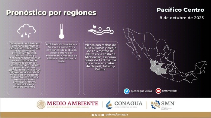 Este domingo, la interacción de tres sistemas al interior de México provocará lluvias torrenciales en gran parte del país. Se trata de la tormenta tropical "Lidia", el ciclón tropical Dieciséis-E y el frente frío 4.En el caso del frente frío número 4, se extenderá desde el oriente del Golfo de México hasta el sureste del país e interaccionará con la circulación del potencial ciclón tropical Dieciséis-E al sur de Guerrero, produciendo lluvias fuertes a intensas en gran parte de la República Mexicana.La masa de aire frío reforzada, ocasionará evento de “Norte” con rachas de viento de 70 a 90 km/h y oleaje de 2 a 4 metros de altura en las costas de Tamaulipas, Veracruz, Istmo y Golfo de Tehuantepec.Asimismo, se prevén rachas de viento de 60 a 80 km/h y oleaje de 2 a 4 metros de altura en las costas de Oaxaca y Guerrero. Un canal de baja presión se extenderá sobre el noroeste y occidente del territorio nacional, aunado a la amplia circulación de "Lidia”.Estas condiciones propiciarán chubascos y lluvias puntuales muy fuertes en las regiones mencionadas, además de puntuales intensas en Baja California Sur, Nayarit, Jalisco, Colima y Michoacán. Las lluvias estarán acompañadas con descargas eléctricas y posible caída de granizo; dichas lluvias, en el rango de torrenciales, intensas, muy fuertes y fuertes, podrían originar visibilidad reducida, deslaves, encharcamientos o inundaciones, así como incremento en los niveles de ríos y arroyos.MV