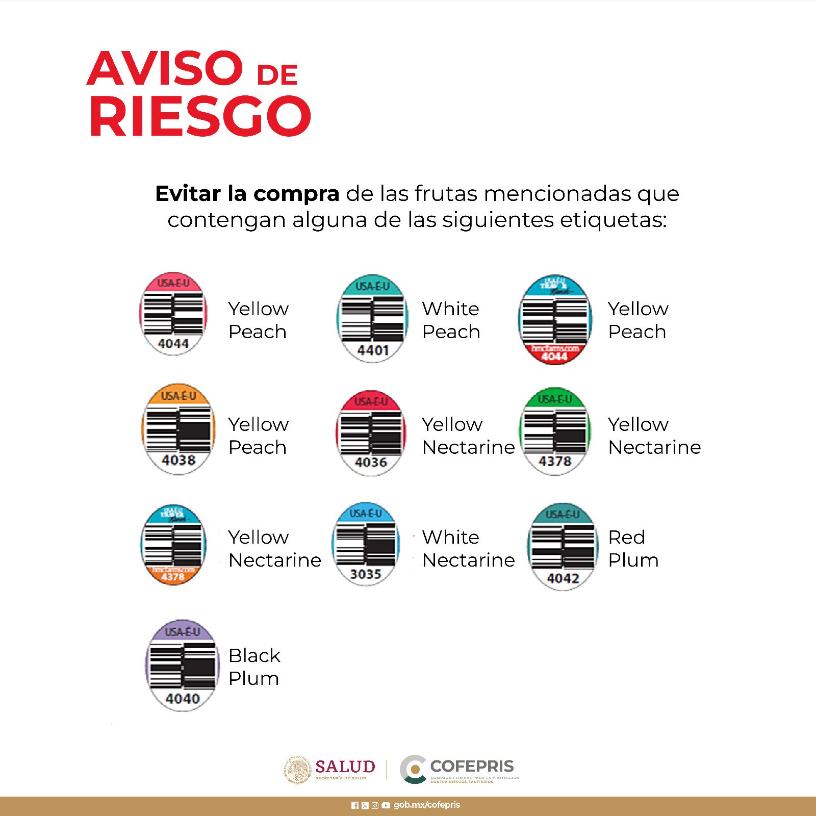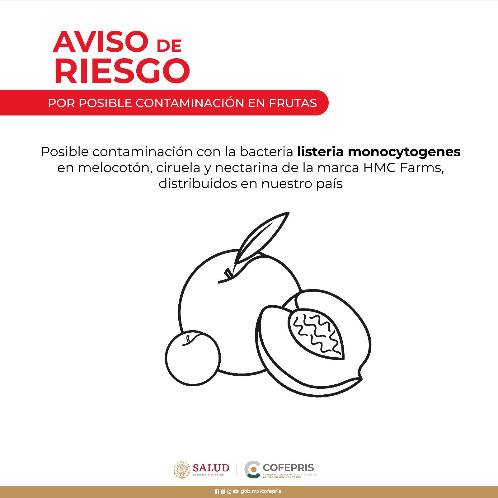 La Comisión Federal para la Protección contra Riesgos Sanitarios (Cofepris) informó sobre la posible contaminación con la bacteria Listeria monocytogenes en melocotón o durazno, ciruela y nectarina (una variedad de durazno), de la marca HMC Farms, luego de que la empresa HMC Group Marketing, INC llevara a cabo su retiro de los mercados en Estados Unidos por la misma razón.La Cofepris emitió un aviso de riesgo, para alertar a la población que estos productos fueron importados a México desde Estados Unidos entre el 1° de mayo y el 15 de noviembre de 2023, por lo que exhorta a la población a que, previo a adquirir las frutas antes mencionadas, se revisen las etiquetas y, en caso de que sean como las que se muestran a continuación, deberán evitar la compra y consumo:La Listeria monocytogenes causa listeriosis, enfermedad particularmente nociva para grupos de alto riesgo como embarazadas, adultos mayores y personas con sistemas inmunitarios debilitados, señala el comunicado de la Cofepris.De acuerdo con información de la Organización Panamericana de la Salud (OPS), el periodo de incubación de la listeriosis suele ser de una a dos semanas, e incluso puede extenderse hasta tres meses en estos grupos vulnerables, quienes desarrollan síntomas como fiebre, dolores musculares, septicemia y meningitis.Asimismo, la OPS indica que las personas que no pertenecen a grupos de alto riesgo, y que contraen listeriosis, pueden presentar diarrea, fiebre, dolor de cabeza y dolores musculares.La Comisión recomienda que, en caso de presentar algún síntoma tras haber consumido alguno de estos alimentos, acuda con su profesional de la salud, quien a través de valoración, estudios y análisis proporcionará un diagnóstico especializado y el tratamiento a seguir.*Mantente al día con las noticias, únete a nuestro canal de WhatsApp aquí: https://whatsapp.com/channel/0029VaAf9Pu9hXF1EJ561i03MV