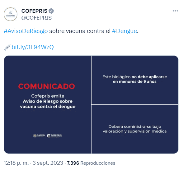 La Comisión Federal para la Protección contra Riesgos Sanitarios (Cofepris) dio a conocer ayer que alerta a médicos generales, personal de enfermería y pediatras sobre el aviso de riesgo en la aplicación de la vacuna tetravalente contra el dengue, Dengvaxia, a niños menores de 9 años.El biológico está indicado para personas en el rango de edad de 9 a 45 años que viven en áreas endémicas de dengue. Cofepris ha detectado que la vacuna está siendo aplicada en población infantil menor a 9 años, por médicos generales y especialistas, entre ellos los pediatras, lo cual representa un riesgo para la salud de ese grupo poblacional.La Cofepris exhorta a los profesionales de la salud que, previo a la aplicación de este biológico, se debe verificar que el empaque se encuentre en idioma español, cuente con registro sanitario, número de lote y fecha de caducidad.Los últimos datos deberán coincidir con los plasmados en el frasco ámpula. Además, sugiere al personal médico consultar el instructivo anexo dentro del empaque y revisar la ficha técnica de Dengvaxia disponible en la página https://www.gob.mx/cofeprisLa Comisión Federal señala que la vacuna Dengvaxia deberá ser administrada bajo valoración, supervisión médica y recalca que no deberá administrarse a menores de 9 años, puesto que podría representar un riesgo a la salud.Asimismo, hace un llamado al personal de la salud y a la población a no adquirir medicamentos en redes sociales, plataformas de venta u otros sitios de Internet, ya que podría tratarse de un producto falsificado, elaborado con ingredientes contaminados, de mala calidad y carecer del principio activo.OF
