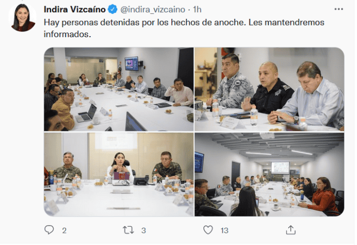 "Nos encontramos reunidas y reunidos en el C5i, como parte de la sesión permanente de la Mesa de Coordinación Estatal para la Construcción de Paz y Seguridad. Todas las corporaciones nos encontramos en alerta y coordinadas para proteger a las y los colimenses. Hay personas detenidas por los hechos de anoche. Les mantendremos informados", publicó la gobernadora esta mañana de viernes en sus redes sociales.