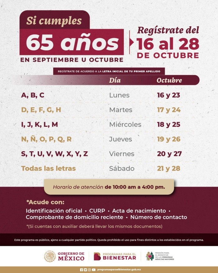 La Pensión del Bienestar es un programa social al que tienen acceso los adultos mayores que han alcanzado la edad de 65 años o más. Este programa tiene como objetivo mejorar la calidad de vida de los adultos mayores, recibiendo un apoyo económico bimestral.Cada cierto tiempo se abren los registros para que los adultos mayores se inscriban exitosamente al programa de la Pensión Bienestar; pero, en caso de que por algún motivo ya cumpliste la edad requerida para solicitar el apoyo y aún no formas parte, la Secretaría del Bienestar, Ariadna Montiel ha exhortado a la población a que se registren en los días que se especifica cada bimestre.La nueva convocatoria de registro cierra el próximo 28 de octubre de 2023, por lo que aún hay tiempo para registrarse exitosamente. Los registros se hacen por la inicial del apellido, pero en caso de que ya haya pasado tu letra, aún puedes asistir.En ese sentido, si no alcanzaste a registrarte, aún puedes asistir este 28 de octubre a tu módulo Bienestar con tus documentos: Identificación oficial vigente, acta de nacimiento, CURP, Comprobante de domicilio no mayor a seis meses, teléfono de contacto celular y casa. En caso de que se te vuelva a pasar la fecha, toma en cuenta que el registro se abre cada dos meses.El adulto mayor puede ir acompañado de quien será su persona auxiliar y nombrarla ahí mismo, si así lo requiere. Para mayor información, puedes llamar a la Línea del Bienestar 800 639 42 64.Sigue al día con las noticias, únete a nuestro canal de Whatsapp.MM