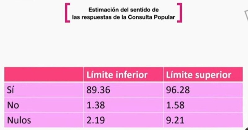En la consulta popular de este 1 de agosto en México se registró una participación ciudadana de alrededor del 7% del padrón electoral, informó hoy el Instituto Nacional Electoral (INE) con base en datos del conteo rápido.Esa participación está muy por debajo del 40% requerido (37.4 millones) de los 93.6 millones de los ciudadanos en el padrón para que el resultado de la consulta sea vinculante u obligatorio.El consejero presidente del INE, Lorenzo Córdova, detalló que en las 57 mil 70 mesas receptoras o casillas que se lograron instalar este domingo, el porcentaje estimado de participación de la fue de un 7.07 y 7.74%. "¿Estás de acuerdo o no en que se lleven a cabo las acciones pertinentes, con apego al marco constitucional y legal, para emprender un proceso de esclarecimiento de las decisiones políticas tomadas en los años pasados por los actores políticos encaminado a garantizar la justicia y los derechos de las posibles víctimas?", fue la pregunta a la que los ciudadanos respondieron.La papeleta permitirá votar por las opciones “Sí” o “No”.Según los datos del conteo rápido del INE, los participantes votaron en su mayoría de "Sí", con entre el 89.36 y 96.28% de las opiniones, mientras que el "No" obtendría entre el 1.38 y 1.58%. Por otra parte, los votos nulos se estiman entre el 2.19 y 9.21%."El conteo rápido es un procedimiento estadístico diseñado con el fin de estimar las tendencias de los resultados finales, a partir de la selección de una muestra aleatoria de todas las Mesas Receptoras instaladas el día de la Jornada de la Consulta Popular, donde todas tienen una probabilidad de ser seleccionadas", define el INE.Si te interesó esta noticia y quieres saber más, entonces descarga y descubre INFORMAPlus, la aplicación digital de EL INFORMADOR, en donde tenemos contenidos exclusivos, seleccionados por nuestros editores, para darles una experiencia más completa a los lectores. Descarga la aplicación y pruébala GRATIS por treinta días. Para iOS: https://apple.co/35jaVgbPara Android: https://bit.ly/3gwVSEVSi eres suscriptor de EL INFORMADOR tu acceso está incluido, solicítalo al 33 3678-7777IM