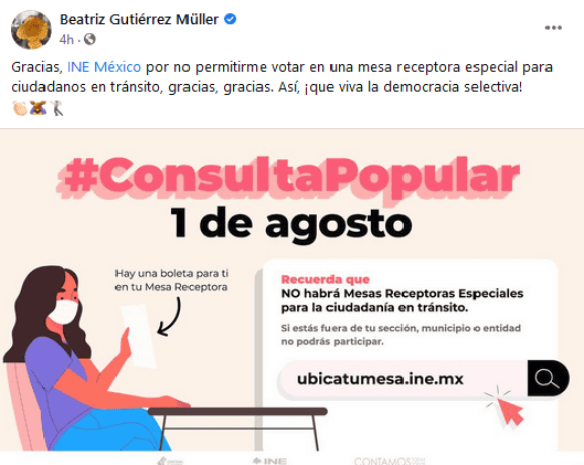 Beatriz Gutiérrez Müller criticó al INE porque no pudo emitir su opinión en una “mesa receptora especial para ciudadanos en tránsito” cuya ubicación no dio a conocer."Gracias, INE México por no permitirme votar en una mesa receptora especial para ciudadanos en tránsito, gracias, gracias. Así, ¡que viva la democracia selectiva!", escribió la esposa del Presidente Andrés Manuel López Obrador (AMLO) en la red social de Facebook.De esa forma, la historiadora expresó su molestia por no poder participar en la primera consulta popular, organizada por el INE, en la cual se les pregunta a los ciudadanos si está de acuerdo o no con la posibilidad de abrir procesos penales contra los ex presidentes de México.Ayer sábado, en su gira de trabajo por Sinaloa y Durango, AMLO acusó a la autoridad electoral de no instalar las casillas suficientes para la consulta popular."Desgraciadamente los que deberían de estar promoviendo esta consulta no quisieran que se supiera nada, ni hay casillas suficientes (…) voy a Nayarit y estaba pensando en votar, pero no hay, no va a haber casilla y no se escucha nada, no se informa...silencio, cuando deberían de estar promoviendo la participación de la gente", dijo.Lorenzo Córdova Vianello respondió a las críticas realizadas por Gutiérrez Müller y consideró que puede estar mal informada, toda vez que su dirección, para fines electorales, fue actualizada hace meses."Siempre he sido muy respetuoso de la señora Gutierrez Müller, a lo mejor no está informada, su domicilio y el del señor Presidente (AMLO) se actualizó hace unos meses, a lo mejor está mal informada, en la casilla que le toca hay una papeleta esperándola hasta las 6 de la tarde", declaró Lorenzo Córdova en conferencia de prensa.Si te interesó esta noticia y quieres saber más, entonces descarga y descubre INFORMAPlus, la aplicación digital de EL INFORMADOR, en donde tenemos contenidos exclusivos, seleccionados por nuestros editores, para darles una experiencia más completa a los lectores. Descarga la aplicación y pruébala GRATIS por treinta días. Para iOS: https://apple.co/35jaVgbPara Android: https://bit.ly/3gwVSEVSi eres suscriptor de EL INFORMADOR tu acceso está incluido, solicítalo al 33 3678-7777GC