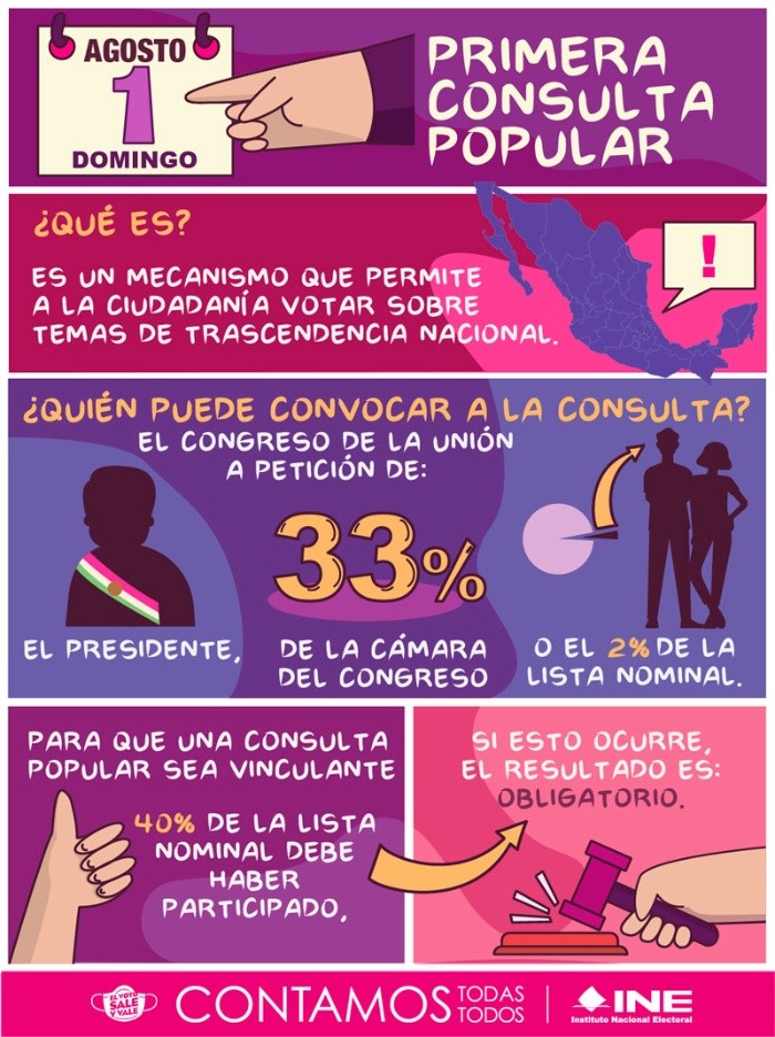 La consulta popular del 1 de agosto de 2021 será histórica, pues será la primera de su tipo en México a nivel federal. A continuación detallamos lo que debes saber sobre este ejercicio ciudadano.El Instituto Nacional Electoral (INE) la define como "un mecanismo directo de participación en el que la ciudadanía aprueba o rechaza una o varias propuestas planteadas con anterioridad sobre temas de interés público".La consulta ciudadana está prevista en el artículo 35 de la Constitución mexicana y está reglamentada en la Ley Federal de Consulta Popular.Para este ejercicio, la casilla de voto se denomina mesa receptora de la consulta popular, la cual está integrada por ciudadanos que fungieron como funcionarios en las elecciones del 6 de junio. La consulta popular del próximo domingo fue convocada por el Presidente Andrés Manuel López Obrador (AMLO), quien asumió al poder en 2018 con la promesa de erradicar la corrupción. Inicialmente la consulta se promovió para que la ciudadanía decidiera si debe enjuiciar a los expresidentes de México por corrupción y otros delitos.La pregunta propuesta originalmente por el Presidente López Obrador era:"¿Está de acuerdo o no con que las autoridades competentes, con apego a las leyes y procedimientos aplicables, investiguen, y en su caso sancionen, la presunta comisión de delitos por parte de los expresidentes Carlos Salinas de Gortari, Ernesto Zedillo Ponce de León, Vicente Fox Quesada, Felipe Calderón Hinojosa y Enrique Peña Nieto antes, durante y después de sus respectivas gestiones?".Pero la Suprema Corte de Justicia de la Nación (SCJN) modificó la pregunta y ya no incluye los nombres de los expresidentes."¿Estás de acuerdo o no en que se lleven a cabo las acciones pertinentes, con apego al marco constitucional y legal, para emprender un proceso de esclarecimiento de las decisiones políticas tomadas en los años pasados por los actores políticos encaminado a garantizar la justicia y los derechos de las posibles víctimas?".La papeleta permitirá votar por las opciones “Sí” o “No”.Ubica tu casilla o mesa receptora a través una de las siguientes opciones:El 1 de agosto no habrá casillas especiales. Solo se podrá votar en la consulta mediante las llamadas mesas receptoras que corresponden al domicilio de tu credencial del INE.Los cómputos los realizarán las Juntas Distritales del 1 al 2 de agosto de 2021.No habrá un Programa de Resultados Electorales Preliminares (PREP), pero el conteo rápido y los cómputos distritales se efectuarán desde noche del 1 de agosto, conforme vayan llegando los paquetes a las 300 Juntas Distritales del INE, y se habilitará un micrositio en el que la ciudadanía podrá dar seguimiento en tiempo real a los cómputos.Los resultados de la consulta popular se difundirán a través la página de internet del INE, redes sociales institucionales y en el Diario Oficial de la Federación.La declaración de validez del proceso de la consulta popular será cuando se resuelvan todos los juicios de inconformidad y le corresponde al Consejo General del INE.Se requiere que vote por lo menos el 40% (37.4 millones) de los 93.6 millones de los ciudadanos mexicanos llamados a las urnas para que los resultados serán vinculatorios u obligatorios para los poderes Legislativo y Ejecutivo federales.Como referencia, las elecciones en México del pasado 6 junio tuvieron una participación del 53% y fue un dato histórico.Con información de EFESi te interesó esta noticia y quieres saber más, entonces descarga y descubre INFORMAPlus, la aplicación digital de EL INFORMADOR, en donde tenemos contenidos exclusivos, seleccionados por nuestros editores, para darles una experiencia más completa a los lectores. Descarga la aplicación y pruébala GRATIS por treinta días. Para iOS: https://apple.co/35jaVgbPara Android: https://bit.ly/3gwVSEVIM