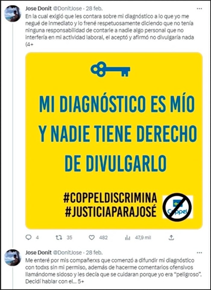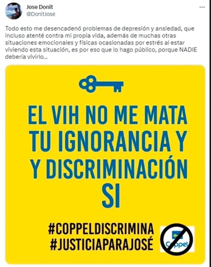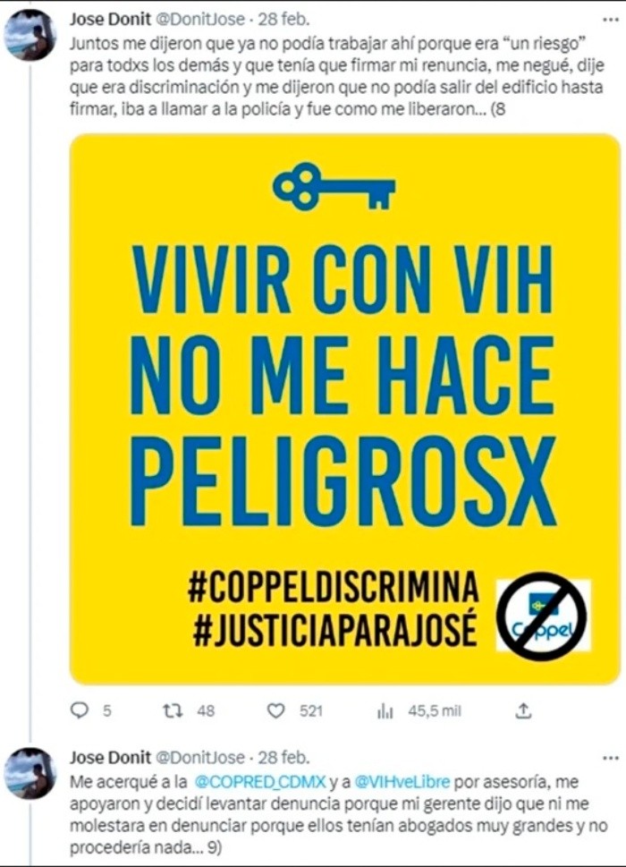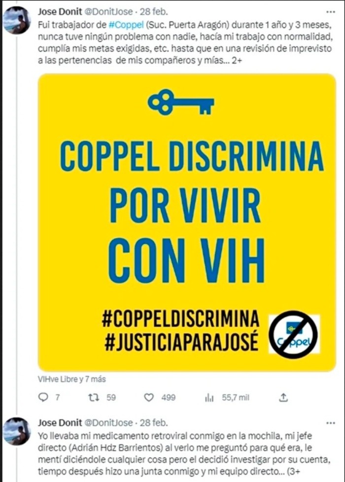 Un supuesto extrabajador de una conocida tienda departamental contó en redes sociales que, cuendo en su empleo se enteraron que padecía VIH, difundieron su diagnóstico sin permiso, fue discriminado y acosado hasta ser despedido "sin argumentos".Por medio de un hilo de Twitter, el usuario @DonitJose narró cómo se fueron suscitando los hechos."Fui trabajador de #Coppel (Suc. Puerta Aragón) durante 1 año y 3 meses, nunca tuve ningún problema con nadie, hacía mi trabajo con normalidad, cumplía mis metas exigidas, etc. Hasta que en una revisión de imprevisto a las pertenencias de mis compañeros y mías vieron que yo llevaba mi medicamento retroviral en la mochila, mi jefe directo (Adrián Hdz Barrientos) al verlo me preguntó para qué era, le mentí diciéndole cualquier cosa pero él decidió investigar por su cuenta", dijo el joven.Aunado a ello, detalló que, en una junta, el jefe directo le exigió que contara sobre lo que padecía. "Yo me negué de inmediato y lo frené respetuosamente diciendo que no tenía ninguna responsabilidad de contarle a nadie algo personal que no interfería en mi actividad laboral, el aceptó y afirmó no divulgaría nada".Sin embargo, el joven comentó que empezó a contarse por toda la empresa e incluso llegó a recibir comentarios ofensivos como "sidoso".Por ello, decidió hablar con su jefe y le explicó sobre "el vih y sida, mi indetectabilidad y los CERO riesgos que corrían al convivir y trabajar conmigo", por lo que el jefe dijo que cerraría el tema "cosa que no cumplió".En tanto, el usuario detalló que pese a poner la queja en recursos humanos el acoso y las ofensas continuaron, hasta que sus jefes le explicaron el motivo por el cual ya no podía laborar en dicha empresa. "Juntos me dijeron que ya no podía trabajar ahí porque era 'un riesgo' para todos los demás y que tenía que firmar mi renuncia, me negué, dije que era discriminación y me dijeron que no podía salir del edificio hasta firmar, iba a llamar a la policía y fue como me liberaron".Luego de que fuera despedido, el joven decidió presentar una denuncia con apoyo de la COPRED y VIHve Libre; sin embargo, sus jefes le dijeron que "ni me molestara en denunciar porque ellos tenían abogados muy grandes y no procedería nada".Finalmente, el usuario confesó que luego de pasar por esa situación "me desencadenó problemas de depresión y ansiedad, que incluso atenté contra mi propia vida, además de muchas otras situaciones emocionales y físicas ocasionadas por estrés al estar viviendo esta situación, es por eso que lo hago público, porque NADIE debería vivirlo"."NADIE debería pasar por algo así, mi diagnóstico no es motivo de incapacidad, mi diagnóstico es mío, mi diagnóstico NO DAÑA ni pone en peligro a nadie, tu ignorancia, discriminación y agresiones contra lxs que vivimos con VIH, SÍ", sentenció.Para poder presentar una denuncia por discriminación, es necesario dejar una petición en el Consejo Nacional para Prevenir la Discriminación (Conapred).Así, deberás ingresar al portal: www.conapred.org.mx, donde pedirá que anotes los campos requeridos y obligatorios como:JM