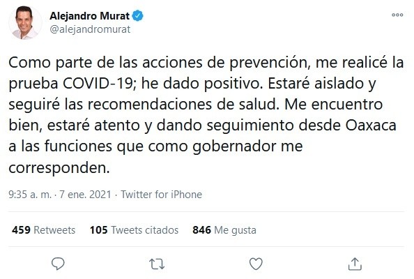 Alejandro Murat, gobernador de Oaxaca, dio positivo a coronavirus COVID-19 y, con ello, se convirtió en el decimoséptimo gobernador en confirmar el virus, con lo que suman ya más de la mitad del total de los mandatarios estatales contagiados.Alejandro Murat informó a través de sus redes sociales: "Como parte de las acciones de prevención, me realicé la prueba COVID-19; he dado positivo. Estaré aislado y seguiré las recomendaciones de salud. Me encuentro bien, estaré atento y dando seguimiento desde Oaxaca a las funciones que como gobernador me corresponden".Con el gobernador de Oaxaca, que pertenece al Partido Revolucionario Institucional (PRI), suman 17 de los 32 mandatarios estatales que han contraído el coronavirus.Es el primer gobernador en notificar su contagio en 2021, pero antes de él, en diciembre, dieron positivo el mandatario de Colima, Ignacio Peralta; Diego Sinhue Rodríguez, de Guanajuato; Alejandro Tello, de Zacatecas, y Jaime Bonilla, de Baja California.El mes anterior, contrajeron el virus la gobernadora de Sonora, Claudia Pavlovich, y la jefa de Gobierno de Ciudad de México, Claudia Sheinbaum, las únicas mujeres entre el total de mandatarios contagiados.También han tenido el virus Carlos Mendoza (Baja California Sur), Mauricio Vila (Yucatán), Omar Fayad (Hidalgo) y Adán Augusto López (Tabasco).Además de Francisco Domínguez (Querétaro), Héctor Astudillo (Guerrero), Francisco García Cabeza de Vaca (Tamaulipas), Carlos Joaquín González (Quintana Roo), José Rosas Aispuro (Durango) y Silvano Aureoles (Michoacán).El contagio de Murat, que ya se había aislado en mayo de 2020 por riegos relacionados con el coronavirus, llega en un momento crítico para México en relación a la pandemia, ya que el país sufre el mayor número de contagios y fallecimientos, de acuerdo a las cifras oficiales.Oaxaca está actualmente en color naranja en el semáforo epidemiológico estatal debido al alto riesgo de contagio y por segunda semana consecutiva.Ese estado concentra 28 mil 860 contagios y dos mil 166 fallecimientos desde la llegada del COVID-19 y las zonas de mayor contagio se encuentran en el Istmo de Tehuantepec y la Cuenca del río Papaloapan.Asimismo, las autoridades informaron el miércoles que la ocupación hospitalaria se encuentra en un 51.8 por ciento.México acumula un total de un millón 479 mnil 835 casos confirmados y 129 mil 987 fallecidos desde que comenzó la pandemia en febrero de 2020.