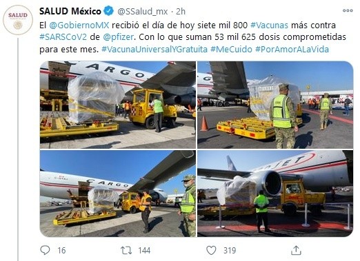 El Gobierno de México informó este miércoles de la llegada al país de siete mil 800 dosis de la vacuna de Pfizer-BioNTech contra el coronavirus SARS-CoV-2, con lo que suman ya 53 mil 625 dosis este mes.En un mensaje a través de redes sociales, la Secretaría de Salud federal detalló que por la mañana llegaron las vacunas procedentes de la planta de Pfizer en Bélgica. Del mismo modo, señaló que el próximo 4 de enero arribará al país un cargamento con más de 50 mil vacunas."Estamos en la primera fase del plan de vacunación contra el coronavirus para proteger a profesionales de la salud, quienes se encuentran en la primera línea de atención directa a pacientes", informó la dependencia."Llegaron más vacunas Pfizer esta mañana. Secretaría de Salud informará número y características en unos minutos. El plan de vacunación avanza", manifestó a su vez el canciller mexicano, Marcelo Ebrard.El plan de vacunación de México arrancó el pasado 24 de diciembre con pocas dosis que están siendo suministradas solo al personal médico que atiende a enfermos de COVID-19 en el área metropolitana de Ciudad de México y en los estados de Coahuila y Nuevo León.El subsecretario de Prevención y Promoción de la Salud, Hugo López-Gatell, afirmó el martes que con el arribo de los nuevos pedidos se planea extender la vacunación a la Zona Metropolitana del Valle de México, que agrupa los estados colindantes con la capital.Y dijo que las autoridades sanitarias planean aplicar de seis mil a ocho mil vacunas diarias.El plan del Gobierno prevé haber vacunado a finales de enero a 700 mil trabajadores de la salud y comenzar la inmunización gratuita y gradual del resto de la población, de 130 millones de habitantes, en función de las edades y de enfermedades crónicas.Para ello, México confía en los contratos de precompra de 34.4 millones de vacunas de la estadounidense Pfizer, 77,4 millones de la británica AstraZeneca y 35 millones de la china CanSino, pero estas dos últimas todavía no han sido autorizadas para su uso en México.Según el Presidente de México, Andrés Manuel López Obrador, se habrán recibido 14 millones de Pfizer en enero, mismo mes en el que comenzarán a llegar las vacunas de CanSino, mientras que la de AstraZeneca lo harán a partir de marzo.GC
