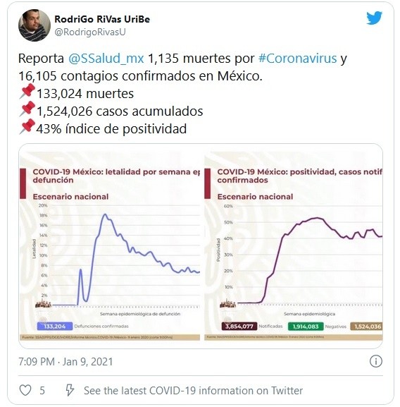 México reportó 16 mil 105 nuevos contagios del coronavirus en las últimas 24 horas, la cifra más alta durante la pandemia, para un total de un millón 524 mil 036 casos confirmados, informaron este sábado autoridades de la Secretaría de Salud.Por cuarto día consecutivo, la cifra de contagios es la más alta reportada en México desde que inició la pandemia, el 28 de febrero de 2020, luego de que en los últimos tres días se reportaran 14 mil 362, 13 mil 734 y 13 mil 345 nuevos casos, respectivamente.Además, se contabilizaron mil 135 nuevas muertes, con lo que la cifra de víctimas mortales llegó a 133 mil 204, mientras que en los últimos cinco días se han reportado más de mil muertes diarias.Con estas cifras, México se mantiene como el cuarto país del mundo con más decesos por la pandemia, detrás de Estados Unidos, Brasil e India, y es el decimotercer país del mundo en cuanto a número de contagios, según la Universidad Johns Hopkins.Desde el inicio de la pandemia en México han sido estudiados tres millones 854 mil 077 pacientes que tuvieron un índice de positividad del 43 %, informó Ruy López Ridaura, director general del Centro Nacional de Programas Preventivos y Control de Enfermedades (Cenaprece) en conferencia de prensa.Entre los pacientes estudiados se tienen un millón 524 mil 036 que tuvieron un positivo a la infección viral, un millón 914 mil 083 con un resultado negativo y 415 mil 958 que se mantienen como casos sospechosos.Además, el funcionario destacó que un millón 143 mil 254 pacientes son clasificados como personas recuperadas.Las proyecciones de las autoridades mexicanas indican que en el país existen un millón 715 mil 495 casos estimados y señalaron que el 5 % de ellos, que corresponden a 93 mil 672, son los que representan la epidemia activa en el país, al ser pacientes que desarrollaron sus síntomas en los últimos 14 días.Sobre el total de muertes se apuntó que la Ciudad de México, el foco de la pandemia en el país, por sí sola acumula 17.5 % de todas defunciones a nivel nacional.En tanto, los estados con mayor ocupación de camas de hospitalización general son la Ciudad de México (90 %), Guanajuato (85 %) y el Estado de México (81 por ciento).En la conferencia se informó de que en México hasta el momento se han vacunado 74 mil 794 personas que forman parte del personal médico.JM