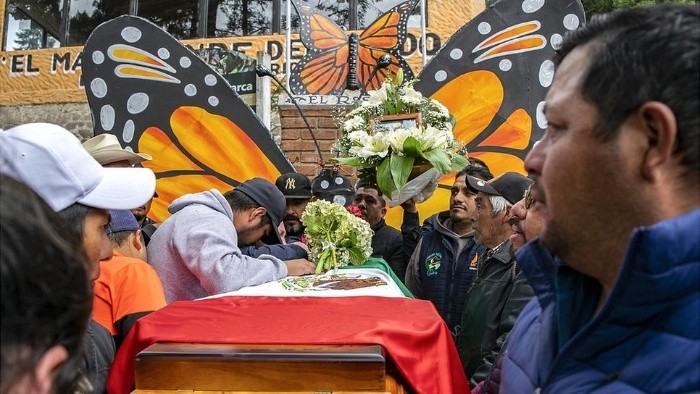 El ataúd con el cuerpo de Homero Gómez fue llevado al santuario de las mariposas monarca. GETTY IMAGES