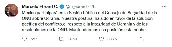Frente a las tensiones en el conflicto entre Ucrania y Rusia, México apuesta por una solución pacífica, el respeto a la integridad de Ucrania y de las resoluciones de la ONU, así lo manifestó el secretario de Relaciones Exteriores, Marcelo Ebrard.A través de Twitter, el canciller expresó la postura que presentará México en su participación ante el Consejo de Seguridad de la ONU en relación al contexto que se vive entre ambos países."México participará en la Sesión Pública del Consejo de Seguridad de la ONU sobre Ucrania. Nuestra postura ha sido en favor de la solución pacífica del conflicto, el respeto a la integridad de Ucrania y de las resoluciones de la ONU. Mantendremos esa posición esta noche", escribió el canciller.La noche de este lunes, el Consejo de Seguridad de Naciones Unidas se reunirá para abordar la crisis Rusia-Ucrania, tras la decisión del presidente ruso, Vladimir Putin, de reconocer la independencia de dos territorios separatistas ucranianos.Estados Unidos y aliados solicitaron la reunión al Consejo, presidido este mes justamente por Rusia. Los países solicitantes, que se basan en una carta de Ucrania a la ONU, incluye entre otros a Francia, Reino Unidos y Albania, según las fuentes.Poco antes, Ucrania había solicitado también una reunión urgente del Consejo.Además de reconocer la independencia proclamada por las regiones separatistas de Donetsk y Lugansk, Putin ordenó a sus fuerzas "mantener la paz" en las regiones separatistas del este de Ucrania. El anuncio generó temores de una invasión inminente.JM