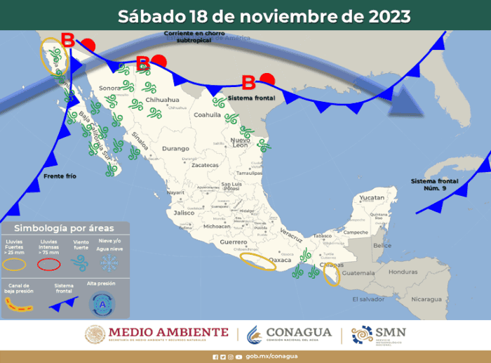 El frente frío 9 se encuentra instalado en el país desde días pasados y aún generarán condiciones climáticas en varias regiones del territorio nacional durante los próximos días, pero el Servicio Meteorológico Nacional (SMN), fuente climática oficial del Gobierno de México, informó ya sobre la aparición de dos fenómenos más que están por ingresar a México y aquí te contamos cuándo y cómo afectarán.El jueves, el frente Núm. 9 se extenderá sobre el Mar Caribe, sin afectar México. La masa de aire frío asociada continuará modificando sus características, favoreciendo un ascenso gradual de las temperaturas sobre la mayor parte del territorio nacional, manteniéndose las heladas durante la madrugada en zonas altas del noroeste, norte, noreste, oriente y centro del país, así como bancos de niebla matinales en la Mesa del Norte, la Mesa Central y la Sierra Madre Oriental.El viernes, dos frentes fríos se aproximarán al noroeste y norte de la República Mexicana, ambos sistemas interaccionarán con la corriente en chorro subtropical, ocasionando rachas fuertes de viento en dichas regiones, así como lluvias y chubascos en la Península de Baja California y Sonora. Asimismo, continuará el incremento de las temperaturas en gran parte del país.El sábado, los dos sistemas frontales se extenderán sobre el noroeste y norte de México, continuarán interaccionando con la corriente en chorro subtropical, propiciando rachas fuertes de viento, lluvias y chubascos en las mencionadas regiones. A su vez, continuará el incremento de las temperaturas sobre la República Mexicana.Finalmente, durante el período de pronóstico, se prevé una disminución en el potencial de lluvia sobre la mayor parte del territorio nacional.Con información del Servicio Meteorológico Nacional* * * Mantente al día con las noticias, únete a nuestro canal de WhatsApp * * *OA