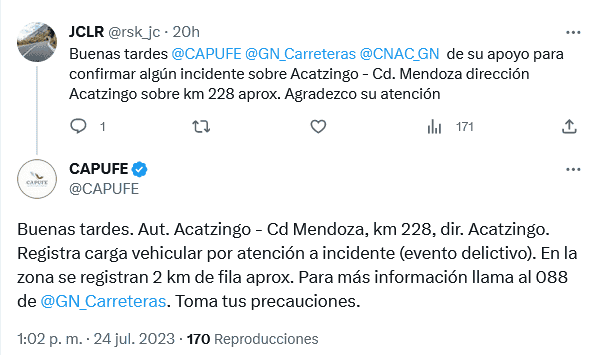 Ayer lunes 24 de julio, presuntamente, cientos de automovilistas permanecieron detenidos en la autopista Puebla-Orizaba, a la altura de Cumbres de Maltrata, debido a un supuesto asalto masivo con armas largas.Aunque Caminos y Puentes Federales de Ingresos y Servicios Conexos (Capufe) informó por medio de su cuenta de Twitter que sobre un posible "evento delictivo", ninguna autoridad se ha pronunciado al respecto."Autopista Acatzingo - Ciudad Mendoza, km 228, dirección Acatzingo. Registra carga vehicular por atención a incidente (evento delictivo). En la zona se registran 2 km de fila aproximadamente", escribió Capufe.Por su parte, algunos automovilistas reportaron redes sociales el asalto, así es como circula un video en el que se ve a los conductores que tuvieron que regresar en sentido contrario debido a que dicha vialidad es de un solo sentido:"Esta carretera es de un solo sentido hacia arriba y vinimos huyendo, todos estos coches en sentido contrario por el tema de asaltos con rifle", dice la voz de un hombre que graba el caos vehicular.Más tarde se reabrió la circulación; hasta el momento no se han dado a conocer heridos o detenidos. OF