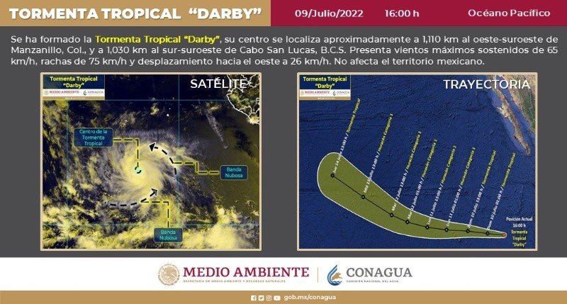 La tormenta tropical "Darby" se formó en el Océano Pacífico, de acuerdo con el Servicio Meteorológico Nacional (SMN).El SMN refirió que el centro de Darby se localiza aproximadamente a mil 110 kilómetros al oeste-suroeste de Manzanillo, en Colima, y a mil 30 kilómetros al sur-suroeste de Cabo San Lucas, en Baja California Sur.En un comunicado, la Comisión Nacional del Agua señaló que "a las 16:00 horas, tiempo del centro de México, se formó la tormenta tropical "Darby" en el océano Pacífico.Tiene vientos máximos sostenidos 65 kilómetros por hora (km/h), rachas de 75 km/h y desplazamiento al oeste a 26 km/h. Además, esta tarde "Bonnie" se debilitó a ciclón post-tropical. Por ello, se detalló que ésta será la última información sobre dicho sistema.