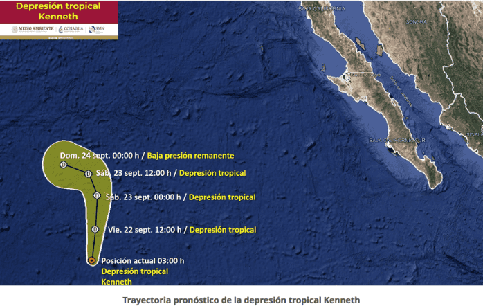 La tormenta tropical "Kenneth" se debilitó en el Océano pacífico y se convirtió en una depresión tropical este viernes 22 de septiembre, informó el Servicio Meteorológico Nacional (SMN), fuente oficial del Gobierno de México en materia climática.De acuerdo al SMN, "Kenneth" se ha debilitado a depresión tropical, su centro se localiza al suroeste de Punta Eugenia, Baja California Sur, no representa peligro para territorio mexicano.La distancia al lugar más cercano del sistema es a mil 455 km al suroeste de Punta Eugenia, BCS. El desplazamiento actual es hacia el norte (355°) a 17 km/h. Mantiene vientos máximos sostenidos de 55 km/h y rachas de 75 km/h.El SMN remarcó que debido a la distancia y trayectoria de la depresión tropical "Kenneth", el sistema no representa peligro para territorio mexicano, aunque se pidió a la población extremar precauciones por viento y oleaje a la navegación marítima.Se espera que el domingo 24 de septiembre, alrededor de las 24:00 horas, "Kenneth" disminuya su categoría a baja presión remanente, cuando se localice a mil 355 km al oeste-suroeste de Punta Eugenia, BCS.Con información del Servicio Meteorológico NacionalOA