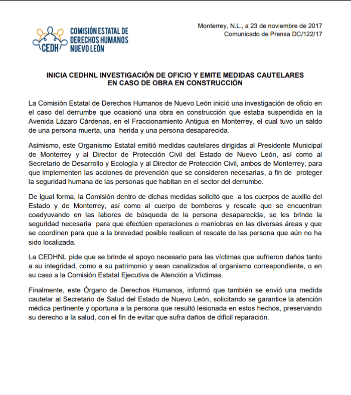 Tras el derrumbe de cuatro viviendas por una obra irregular en construcción, al sur de la capital nuevoleonesa, con saldo de una persona muerta, una herida y una desaparecida, la Comisión Estatal de Derechos Humanos (CEDH) de Nuevo León inició una investigación de oficio.LEE: Derrumbe de casas en Monterrey deja dos muertosEl organismo emitió medidas cautelares a autoridades municipales y estatales, luego del derrumbe en la colonia Antigua, provocado por una obra en construcción que estaba suspendida en la avenida Lázaro Cárdenas.Dichas medidas "van dirigidas al presidente municipal de Monterrey y al director de Protección Civil del Estado de Nuevo León, así como al secretario de Desarrollo y Ecología y al director de Protección Civil, ambos de Monterrey", dijo en un comunicado.Lo anterior, agregó, "para que implementen las acciones de prevención que se consideren necesarias, a fin de proteger la seguridad humana de las personas que habitan en el sector del derrumbe".Dentro de dichas medidas solicitó que se les brinde la seguridad necesaria a los cuerpos de auxilio estatales y municipales, así como al personal de bomberos y rescate coadyuvantes en las labores de búsqueda de la persona desaparecida.Ello, para que efectúen operaciones o maniobras en las diversas áreas y que se coordinen, para que a la brevedad posible realicen el rescate de la persona que aún no ha sido localizada.La CEDH además, pidió que se brinde el apoyo necesario para las víctimas que sufrieron daños, tanto a su integridad como a su patrimonio, sean canalizados al organismo correspondiente, o en su caso a la Comisión Estatal Ejecutiva de Atención a Víctimas.Indicó que también se envió una medida cautelar al secretario de Salud del Estado de Nuevo León, solicitando se garantice la atención médica pertinente y oportuna a la persona que resultó lesionada en estos hechos, preservando su derecho a la salud, con el fin de evitar que sufra daños de difícil reparación.DR