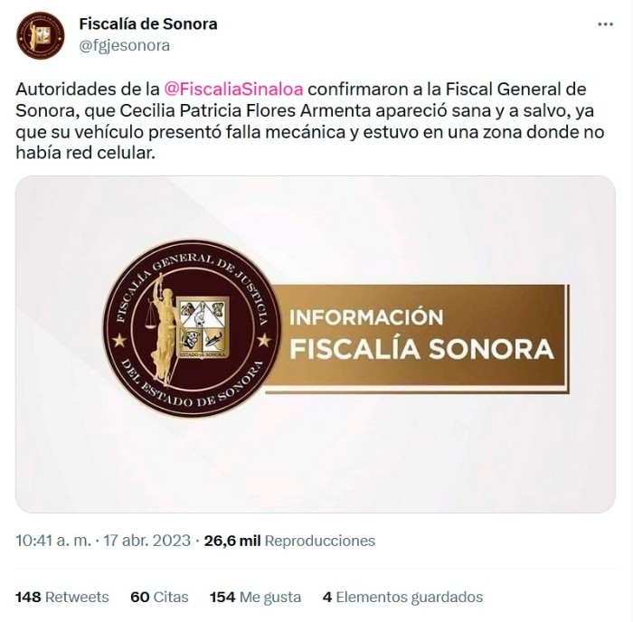 Ceci Flores, madre buscadora de Sonora, fue localizada sana y a salvo luego de permanecer incomunicada durante horas tras ser vista por última vez en Sinaloa.Según reportes, Ceci Patricia Flores estaba en labores de búsqueda en Ahome, Sinaloa, comenzó con diligencias con Policías Estatales y perdió el contacto momentos después.Tanto el gobernador de Sonora, Rubén Rocha Moya, como la Fiscalía estatal emitieron un breve mensaje en el que se detalló la razón por la cual la líder del colectivo perdió comunicación, esto luego de que fuera denunciada su desaparición en redes sociales.El Presidente Andrés Manuel López Obrador confirmó durante su "mañanera" de este lunes que Ceci Flores se encontraba bien, aunque evitó dar mayores detalles sobre el caso; por su parte, la Fiscalía detalló a través de Twitter que "Cecilia Patricia Flores Armenta apareció sana y a salvo, ya que su vehículo presentó falla mecánica y estuvo en una zona donde no había red celular".JM
