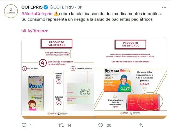 La Comisión Federal para la Protección contra Riesgos Sanitarios (Cofepris) emitió una alerta sobre la venta ilegal de medicamentos infantiles falsificados que podrían representar riesgos a la salud de pacientes pediátricos.Se trata de los productos Rosel solución y Desenfriol-ito plus, por lo que la comisión federal recomendó no consumirlos. La Cofepris determinó la falsificación del producto Rosel (amantadina, clorfenamina, paracetamol) en presentación solución de 60ml, con el lote 200413, que ostenta fecha de caducidad de diciembre 2024, como resultado del análisis que realizó con base en la información presentada por la empresa Wermar Pharmaceuticals.Dicha empresa informó que este medicamento dejó de fabricarse desde abril de 2021, debido a que llevó a cabo actualización de trámite ante la Cofepris.Asimismo, solicitó el apoyo de profesionales de la salud para no recetar este medicamento y buscar otras alternativas de tratamiento.El otro medicamento falsificado es Desenfriol-ito Plus, con fórmula farmacéutica tableta masticable, con denominación X23V7X y fecha de vencimiento de diciembre de 2023.Bayer de México, titular del registro sanitario, comunicó a la Cofepris que la caducidad fue modificada, ya que la fecha del medicamento original es de abril de 2021. Otra de las características del producto irregular es la imagen de la caja, ya que no corresponde a la auténtica para este lote.Cofepris recomienda que, previo a la compra de este tratamiento, se verifique que el lote, la fecha de caducidad e imagen correspondan a los autorizados y se eviten las falsificaciones aquí citadas. También se invita a distribuidores y farmacias a revisar el inventario de Desenfriol-ito Plus y en caso de contar con piezas del producto falsificado se deberá suspender su venta y notificar a esta agencia reguladora.JM